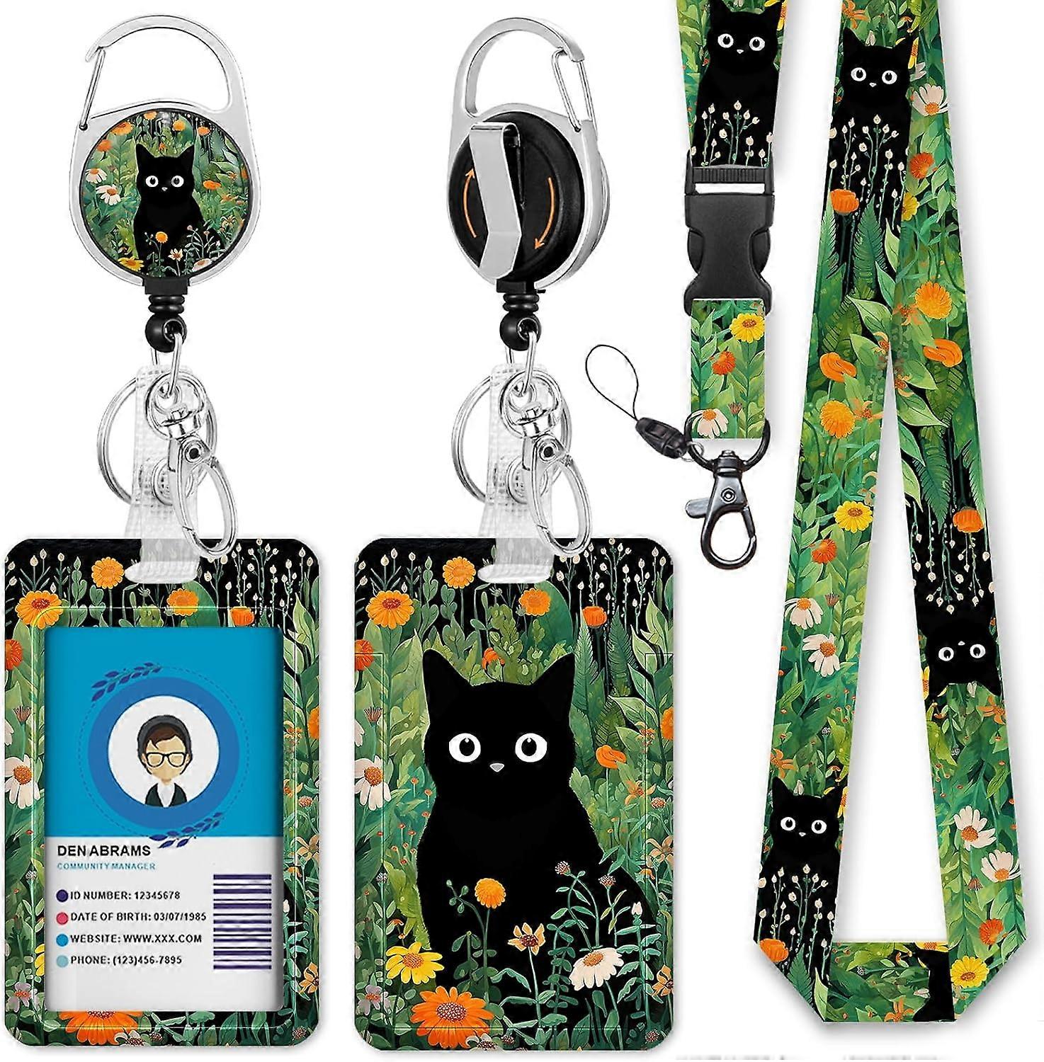 Black Cat Flower Lanyards for Id Badges, Id Badge Holder Heavy Duty and Retractable Keychain, Cute Badge Reel with 360 Degrees Rotate Carabiner Clip,