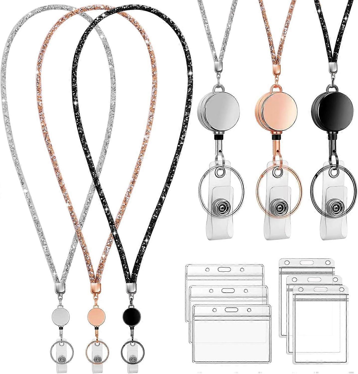 3 Pack Set Retractable ID Badge Holder with Bling Neck Strap Neck Lanyard for Teacher Office Worker