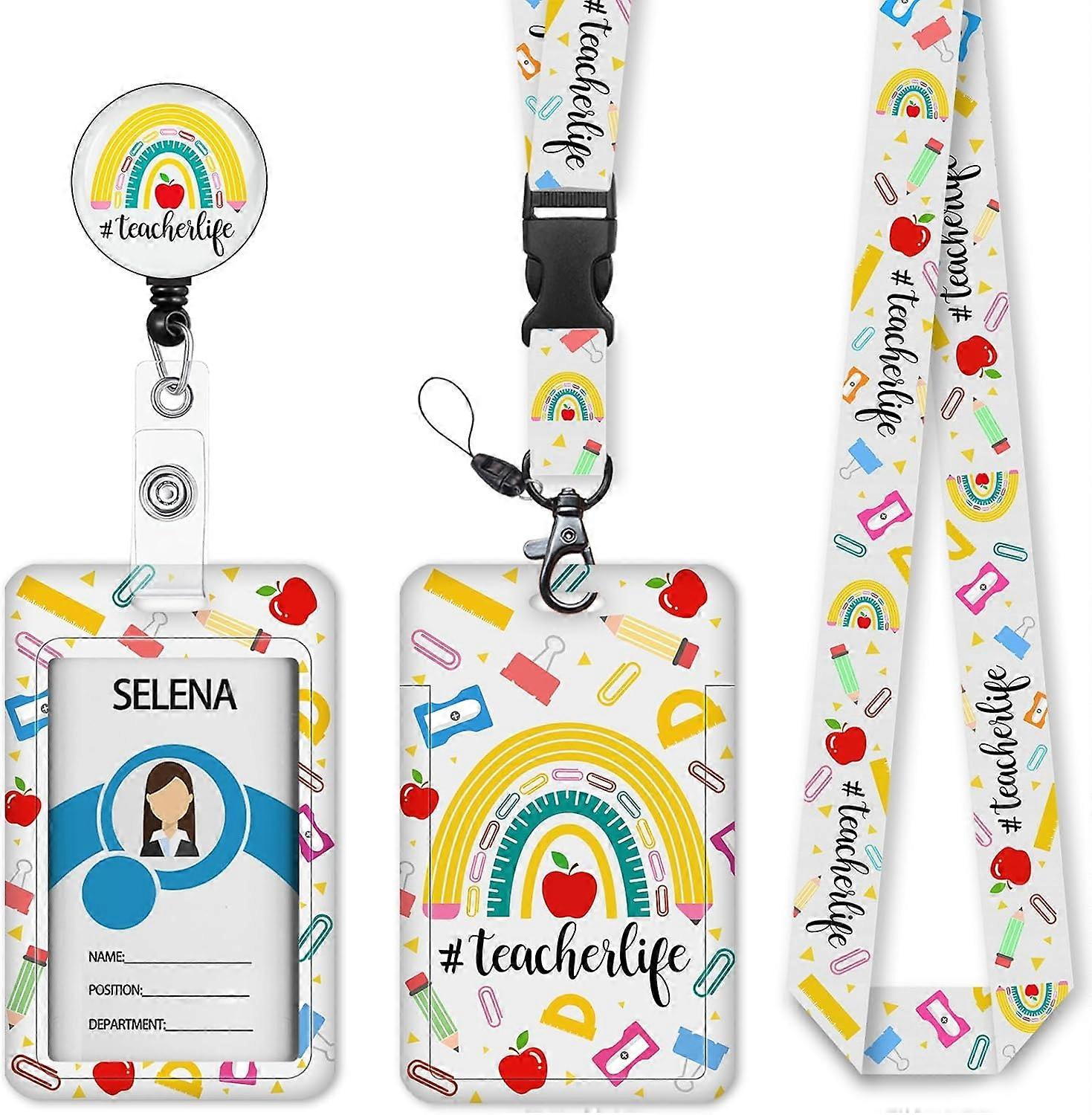 Rainbow Teacher Badge Holder with Retractable Lanyard, Lanyards for ID Badges Name Tags Vertical Card Holder, Breakaway Lanyard Badge Reel Retractabl