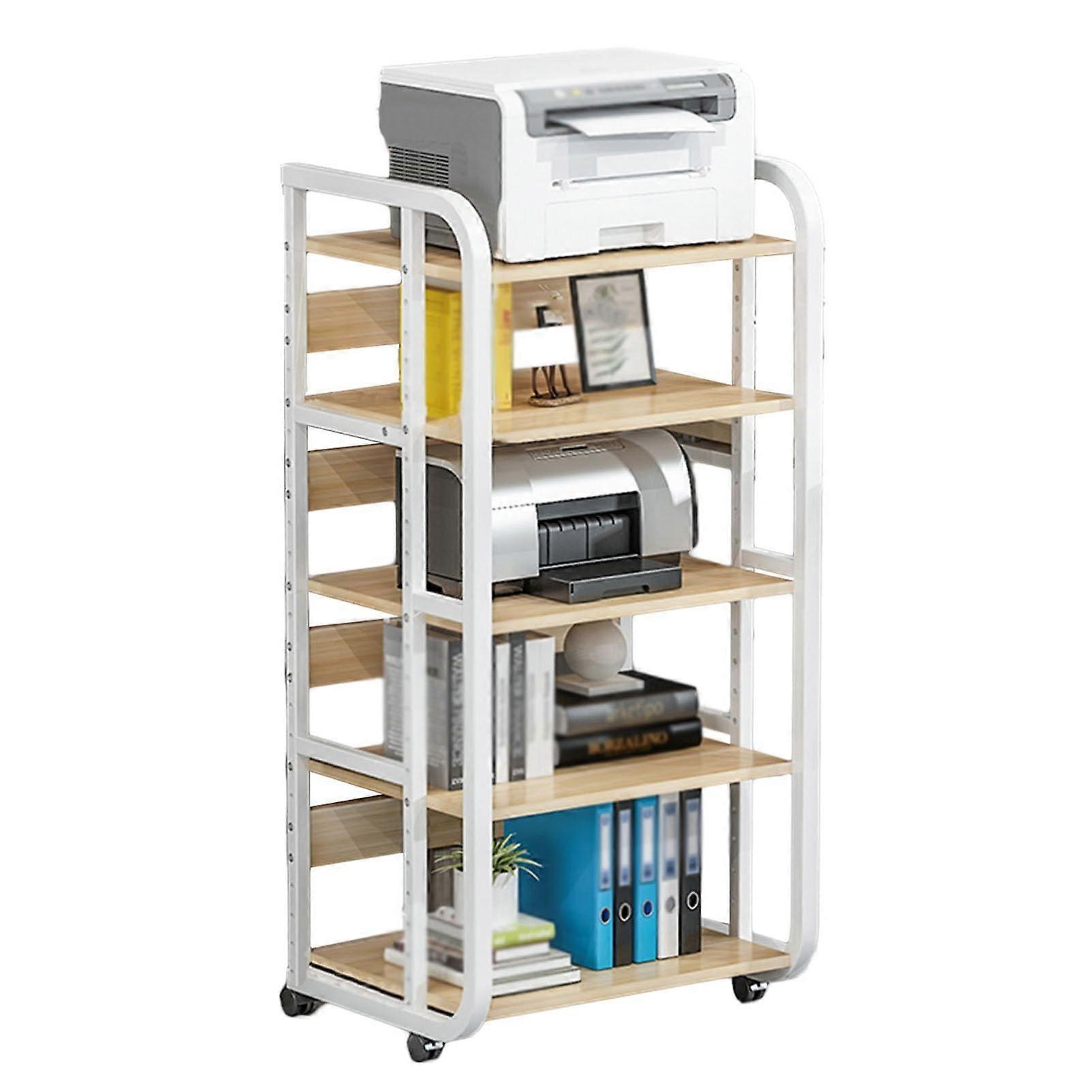 AV Media Stand in White and Light Walnut, 5Tier A versatile, freestanding media stand designed to organize audio equipment, devices, and printed materials while saving floor space. Built from metal and density board for stable, longterm use. Available in three overall heights to fit your setup. Key benefits Flexible storage for multiple devices and media: Designed to hold DVD players, game consoles, speakers, record players, monitors, printers, books, and decorations so you can group equipment by function and keep surfaces clutter. Durable and stable construction: Thickened metal frame and density board shelves provide strong loadbearing capacity and a steady structure that resists shaking. Mobile and adjustable to fit your needs: Silent 360 degree universal wheels make repositioning easy. Shelves offer reserved mounting holes so you can change shelf height and spacing to suit different equipment sizes. Spacesaving footprint: Narrow overall dimensions leave more usable room while providing five tiers of open storage for quick access and ventilation for electronic components. Features Open storage layout for efficient organization and easy access Widened desktop provides ample space for larger devices such as record players or monitors Metal frame combined with density board shelves for durability Adjustable shelf heights via predrilled mounting holes Silent universal wheels for smooth and quiet movement Freestanding assembly with straightforward installation Specifications Product name: AV Media Stand / Open Storage Audio Stand / Vertical Stereo Component Storage / Corner Stand / Printer Storage Stand Color: White and Light Walnut Material: Metal and Density Board Size options (L x W x H): 50 x 42.5 x 70 cm; 50 x 42.5 x 90 cm; 50 x 42.5 x 110 cm Tier count: 5tier Installation type: Freestanding Installation method: Assembly required Package contents 1 x AV Media Stand Practical use scenarios Living room media center: Place a record player or turntable on the widened shelf, store an amplifier, speakers, and game console on lower shelves for a tidy entertainment setup. Home office or workspace: Use as a printer and document station, with room for a small monitor, paper trays, and storage for supplies while remaining easy to move between rooms. Classroom or meeting room: Store presentation equipment, speakers, and reference materials on different tiers for quick access and flexible reconfiguration. Notes Only the storage rack is included; decorative items and electronic devices are not included. Due to photography lighting and manual measurement, allow a measurement tolerance of 1 to 3 cm and slight color variation; refer to the actual product.