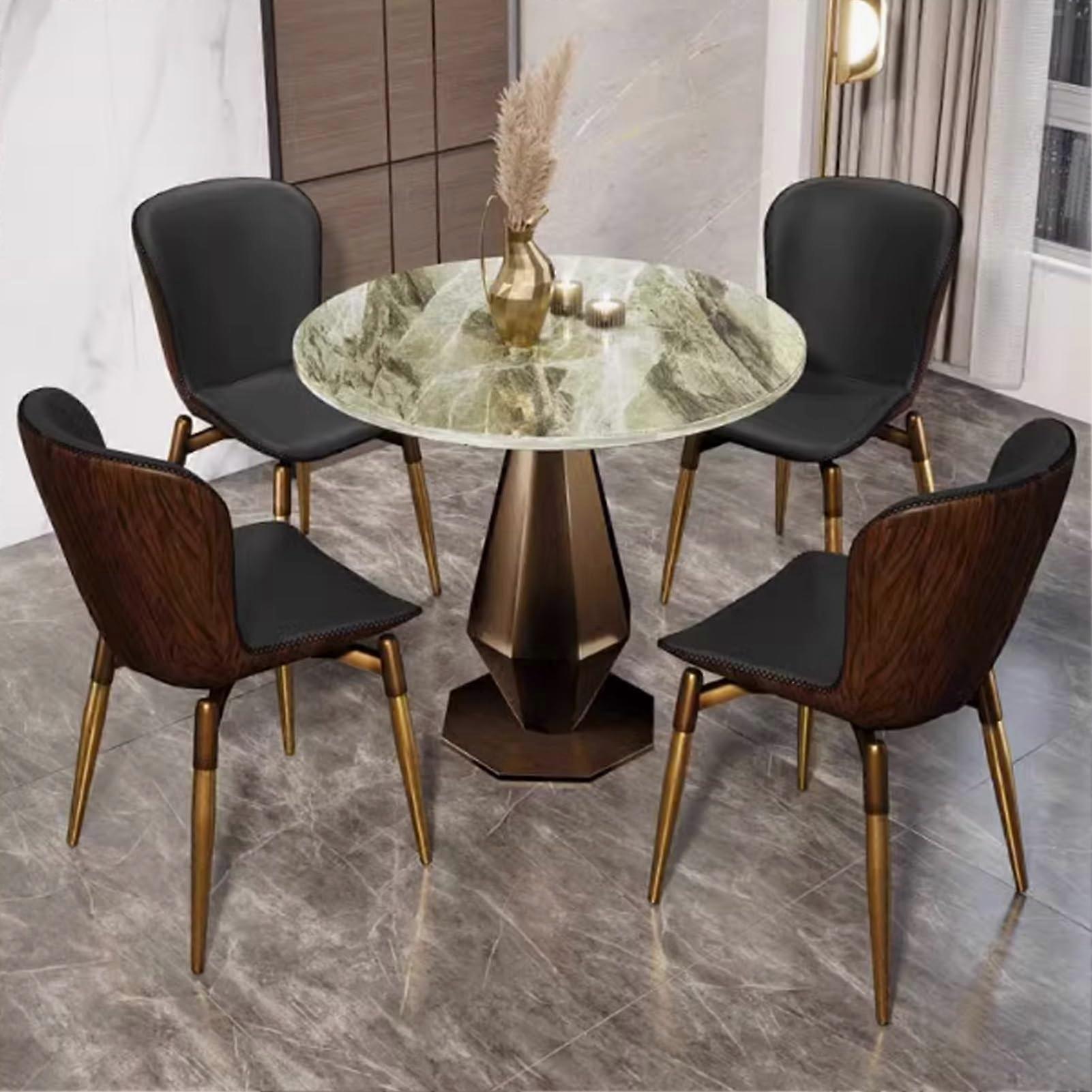 Size and Color Table diameter 90 cm / 35.4 in Color: Dark gray Key benefits Durable, lowmaintenance tabletop with marble effect finish that resists deformation and is suitable for direct food contact. Stable metal construction designed for longterm use in traffic settings. Comfortable seating with breathable, wearresistant leather and resilient density foam for extended sitting comfort. Materials and construction Tabletop: rock slab with a marble effect finish for a smooth, easytoclean surface that maintains its shape. Frame and legs: heavyduty iron frame and chair legs provide stable support and strong loadbearing capacity. Hardware connections are secured and welds are reinforced for stable assembly. Seat: quality leather surface that is breathable and wearresistant. Integrated backrest supports posture and improves ventilation. Interior padding uses density sponge with good resilience. Design features Rounded tabletop corners create smoother edges to help prevent accidental bumps in busy spaces. Neutral dark gray color blends with a variety of interior styles. Compact 90 cm diameter fits small meeting areas while still providing usable surface area. Practical uses Reception and negotiation: compact round table for oneonone meetings or small group discussions in reception rooms and conference spaces. Dining and hospitality: suitable for restaurants, lounges, and guest rooms where a durable, foodcompatible surface is required. Home and multiroom use: works well in kitchens, living rooms, vacation homes, or small dining areas where space and comfort matter. Why choose this set Combines a rigid, foodcompatible tabletop with a stable iron frame for reliable performance. Comfortable seating designed for long use without sacrificing support. Compact and versatile, suitable for commercial and residential settings where durability and easy maintenance are priorities.