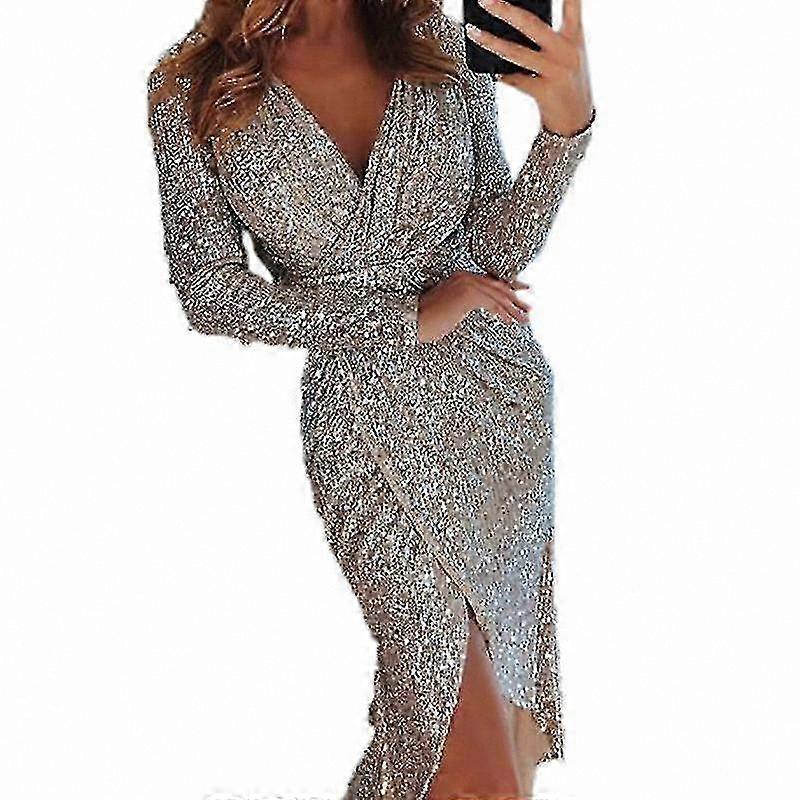 Sequin Long Sleeve V-Neck Evening Dress with Slit for Women
