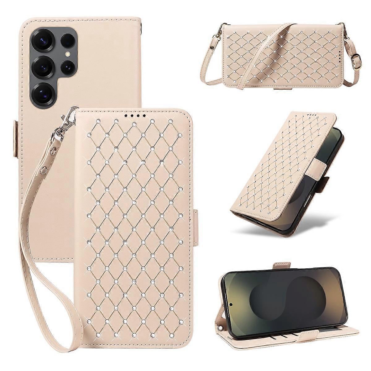 【Luxurious Design】Featuring a rhinestone-studded rhombus pattern with a magnetic flip cover, this phone case combines elegance and functionality. 【Premium Material】Crafted from high-quality TPU + PU leather with a realistic leather texture, the case offers a luxurious feel while providing excellent protection for your device. 【Convenient Storage】Equipped with 3 card slots and a cash pocket, this case doubles as a compact wallet. The magnetic closure ensures your valuables stay secure. 【Enhanced Security】Incorporating RFID blocking technology and folded edge craftsmanship, this case protects your cards from unauthorized scanning. 【Multifunctional】The flip cover can be folded into a stand for comfortable video watching or video calls. A speaker hole on the front cover allows for easy call answering without opening the case. 【Versatile Carrying Options】Comes with a detachable shoulder strap and wrist strap, allowing for multiple carrying styles - handheld, crossbody, or attached to your waist - offering hands-free convenience. Compatible with: •Galaxy S25 Ultra Package included: •1 x Phone Case •1 x Shoulder Strap •1 x Wrist Strap •Other items not included