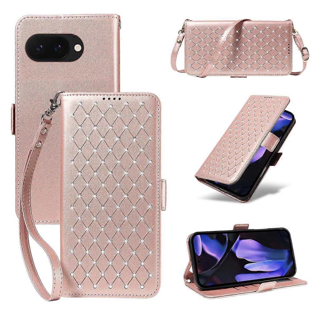 For Google Pixel 9a Leather Case Rhinestone Decor Rhombus Pattern Wallet Stand Flip Phone Cover with