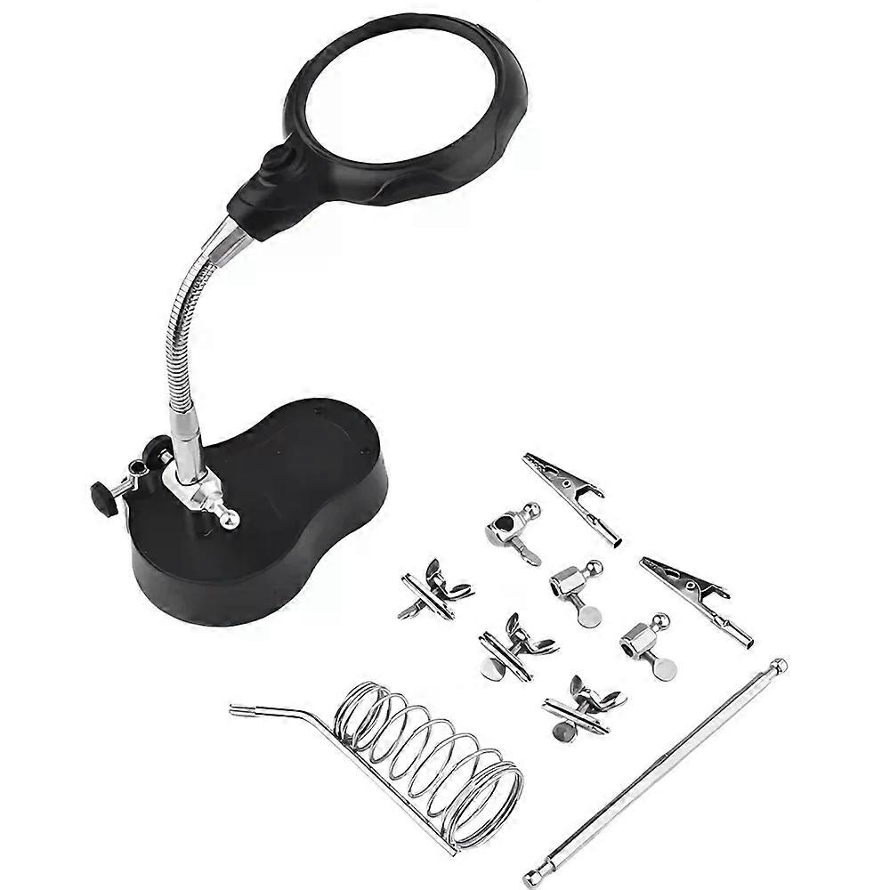 [DETAIL]<br>High-quality stainless steel material :Made of durable stainless steel, this magnifier is built to last and withstand heavy use.<br>• LED light source for bright illumination :The LED light source provides bright and clear illumination, making it easy to see and work with small parts.<br>• Versatile use for various tasks :This magnifier can be used for a variety of tasks such as soldering, circuit board repair, and other precision work.<br>• Adjustable clip design for customized use :The adjustable clip design allows for customized use, making it easy to focus on specific areas and angles.<br>Selling point:<br>High quality: the product is made of high quality metal and environmental protection material, the magnifying glass is made of Alec lens, strong toughness is not broken, acrylic lens anti ultraviolet performance is good, not easy to yellow, healthy and beautiful safety and environmental protection.<br>Led light: The enlarged work light includes 2 bright LED lights, which can help you work better in the dark. If you install a battery, the battery life is up to 10 hours (Shipment Batteries Not Included)<br>Two-in-one lens design: The welding magnifying glass has two magnifying devices with different diameters, which produce 3.5X and 12X magnification effects respectively. You can use different projects according to different needs, which greatly provides work efficiency;<br>Easy to use: The product has a desktop magnifying glass with LED lights, the distance and angle of the light can be adjusted freely, and the support clip and alligator clip can also be adjusted freely, making it more convenient and comfortable for you to use.<br>360 degrees: The product is equipped with a stainless steel hose, which can rotate freely at any angle of 360 ° to provide convenience for work. The base is made of metal to increase the weight of the base and enhance stability.<br>Widely used: The products are widely used in repair industry, inspection, industrial electronics, laboratory, medical treatment, identification of jade, coins, jewelry, jade, porcelain, bronze, antiques and many other fields.<br>Parameters:<br>Product material: ABS + alloy<br>Main lens magnification: 3.5X<br>Vice lens magnification: 12X<br>Main lens diameter: 6.5cm<br>Deputy lens diameter: 1.7cm<br>Base size: 10x6.5x2cm<br>Product size: 15*14*6cm (after assembly)<br>Solder frame size: 3x9cm<br>Product list:<br>welding rack * 1 + alligator clip * 2 + base with magnifying glass * 1 + lifting knob * 1 + universal clip * 3 + electric soldering iron bracket * 1 + manual * 1 (Shipment Batteries Not Included)(Shipment Batteries Not Included)<br><br>[ATTRIBUTES]<br>- High-concerned chemical: None<br>- Material: Metal<br>- Type: Combination<br>- High-concerned chemical: None<br>- Material: Metal<br>- Type: Combination<br>- Application: Household Tool Set<br>- Origin: Mainland China<br>- is_customized: No<br>- DIY Supplies: Electrical