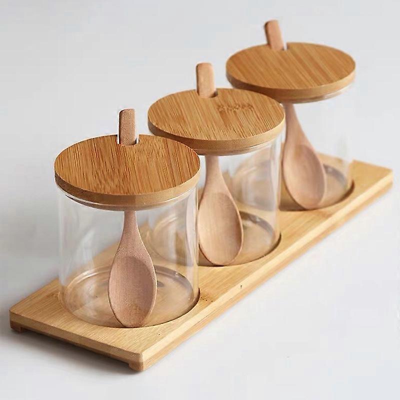 Kitchen Glass Condiment Jar Set Wood Lid with Tray Spoon Clear Seasoning Spice Salt Jar Dust-Proof Coffee Beans Organizer Bottle