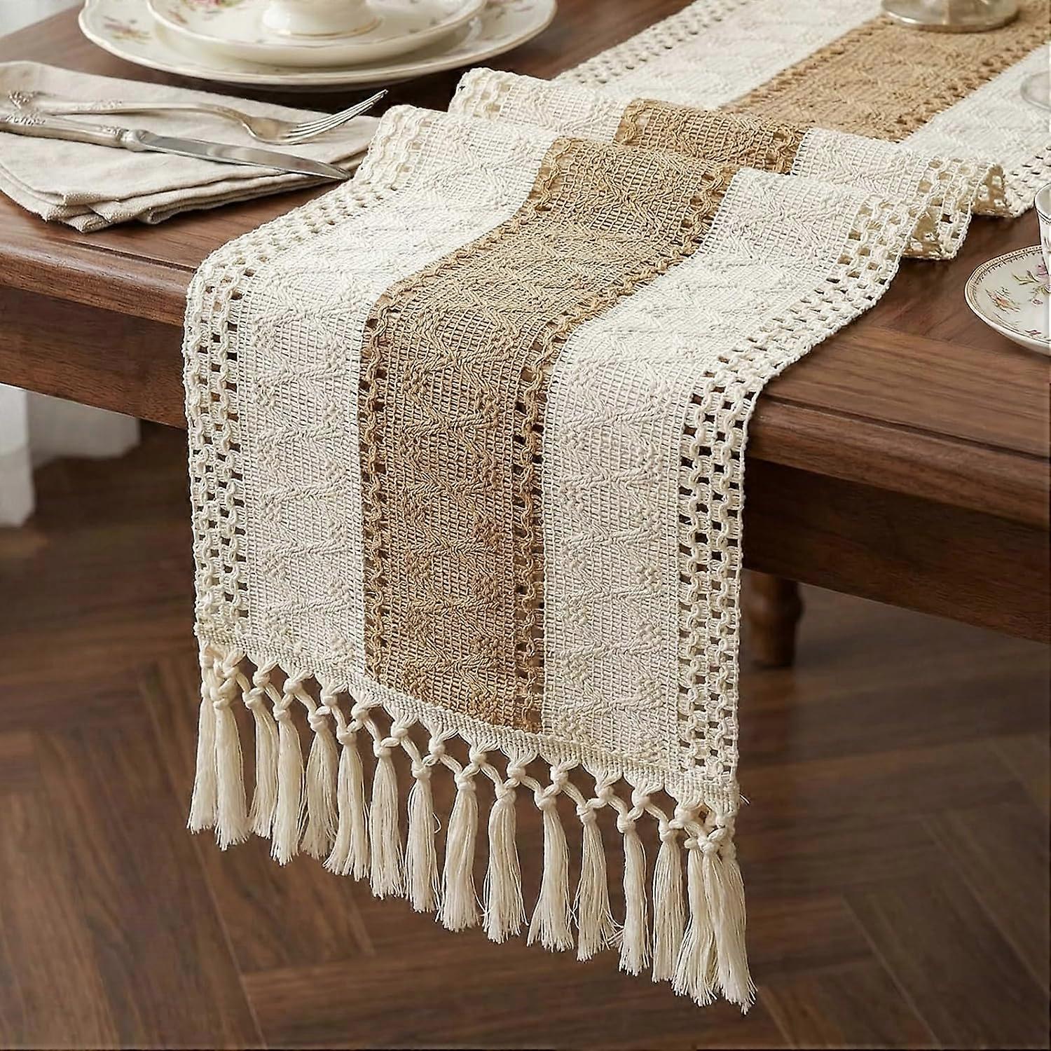 Boho Macrame Table Runner with Tassels Farmhouse Rustic Dining Woven Table Runner for Bedroom Dresser Kitchen Home Decor(White & Brown, 12x71in)