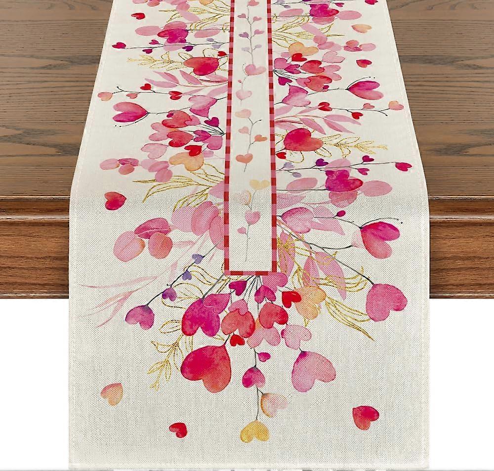 Red Pink Heart Branch Table Runner, Seasonal Leaf Kitchen Dining Table Decoration for Home Party Decor 13x72 Inch