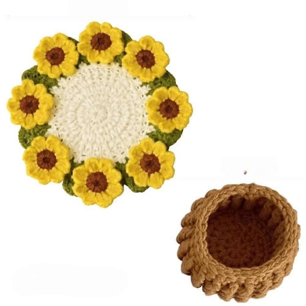 New Mini Daisy Bouquet Coaster Sunflower with Basket Flora Cup Pads Washable Soft and Cute Crochet Coasters Home Decoration