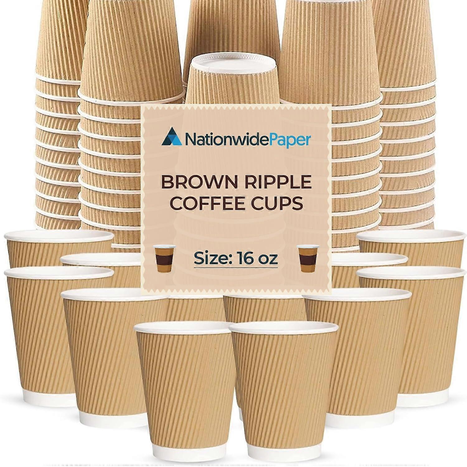 These 16oz ripple paper cups are a practical, nofuss solution for serving hot beverages on the go. The triplewall construction plus ripple texture provides reliable insulation and a comfortable nonslip grip, reducing the need for sleeves while keeping hands comfortable. Sold in a pack of 100 cups without lids, they are sturdy, disposable, and designed for frequent use in food service or everyday settings. Key benefits Keeps drinks at serving temperature longer thanks to triplewall insulation and ripple texture. Comfortable, secure handling with a nonslip ripple surface that reduces heat transfer to hands. Durable, extrastrong construction minimizes collapsing or softening with hot liquids. Readytouse disposable format simplifies service and cleanup when lids are not needed. Features Size: 16oz (470ml) capacity for generous servings of coffee, tea, or other hot drinks. Type: Triple wall insulated paper cup with ripple exterior for added grip and insulation. Color: Brown. Quantity: 100 cups per pack, sold without lids. Functional: Designed for easy carrying, reduced leakage risk during normal use, and disposable convenience. Typical use scenarios Coffee and takeaway service: Serve large lattes or brewed coffee to customers who prefer a lidless option for in or outdoor consumption. Office or event catering: Provide a quick, sturdy cup for meetings, conferences, and staff kitchens where fast cleanup is important. Outdoor gatherings and catering: Use at picnics, food stalls, or catering stations where a durable hot beverage cup is needed without extra accessories. Product notes Cups are intended for hot beverages and are sold without lids. Pack size and specifications: 100 cups, 16oz (470ml), brown triplewall ripple paper cups.