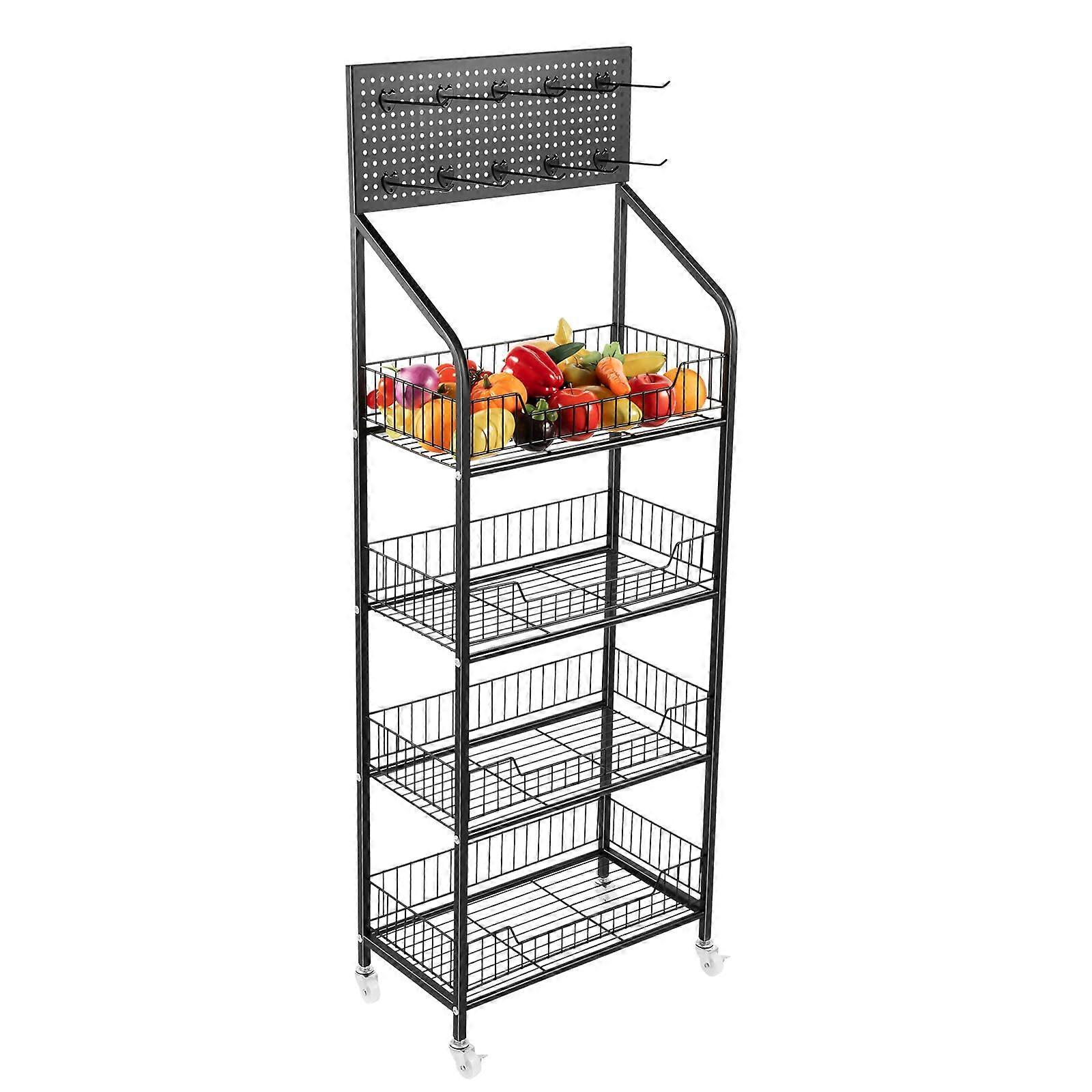 Snack Display Rack 4 Tier with Wheels, Black Metal Rolling Storage Cart with 10 Hooks