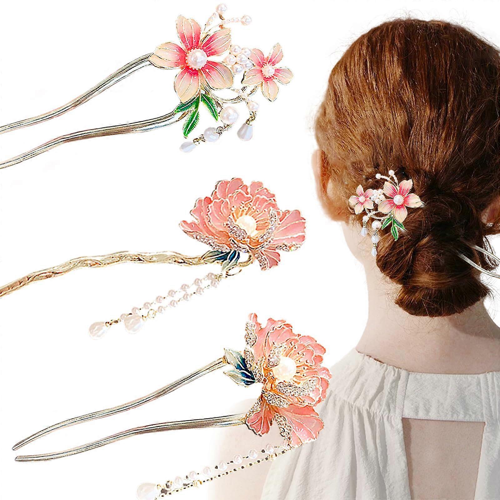 3PCS Chinese Flower Hair Sticks Set with Pearl Tassels, Vintage Metal Hair Chopsticks for Women