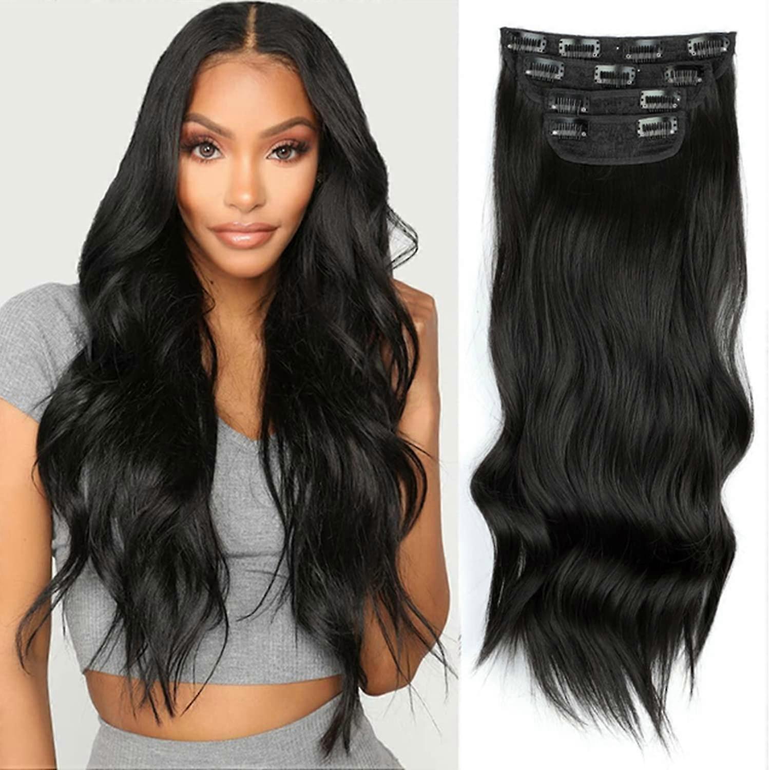 Long Wavy Clip in Hair Extensions 20 Inch Black Synthetic Full Head Thick Natural Volume Boost