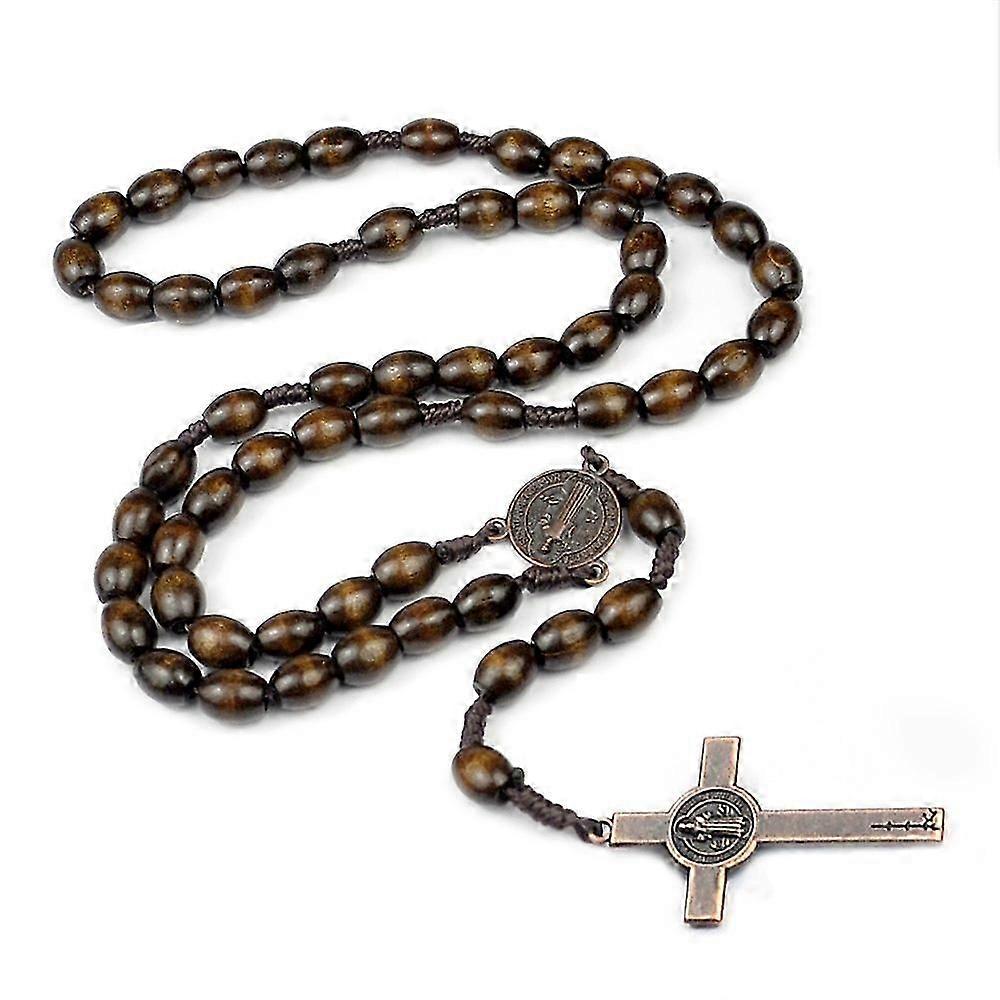 SQLX New Catholic cross Rosary necklace, natural wood prayer beads cross Dark brown HK