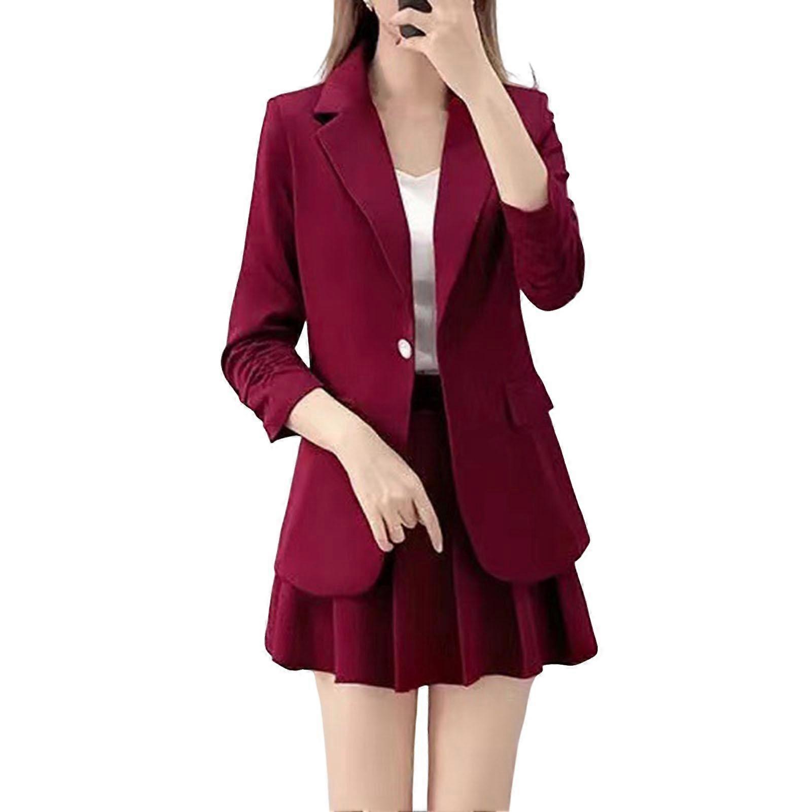 2Pcs/Set Coat Skirt Set Women Spring Autumn Lapel Long Sleeve Single Button Suit Coat Pleated Mini