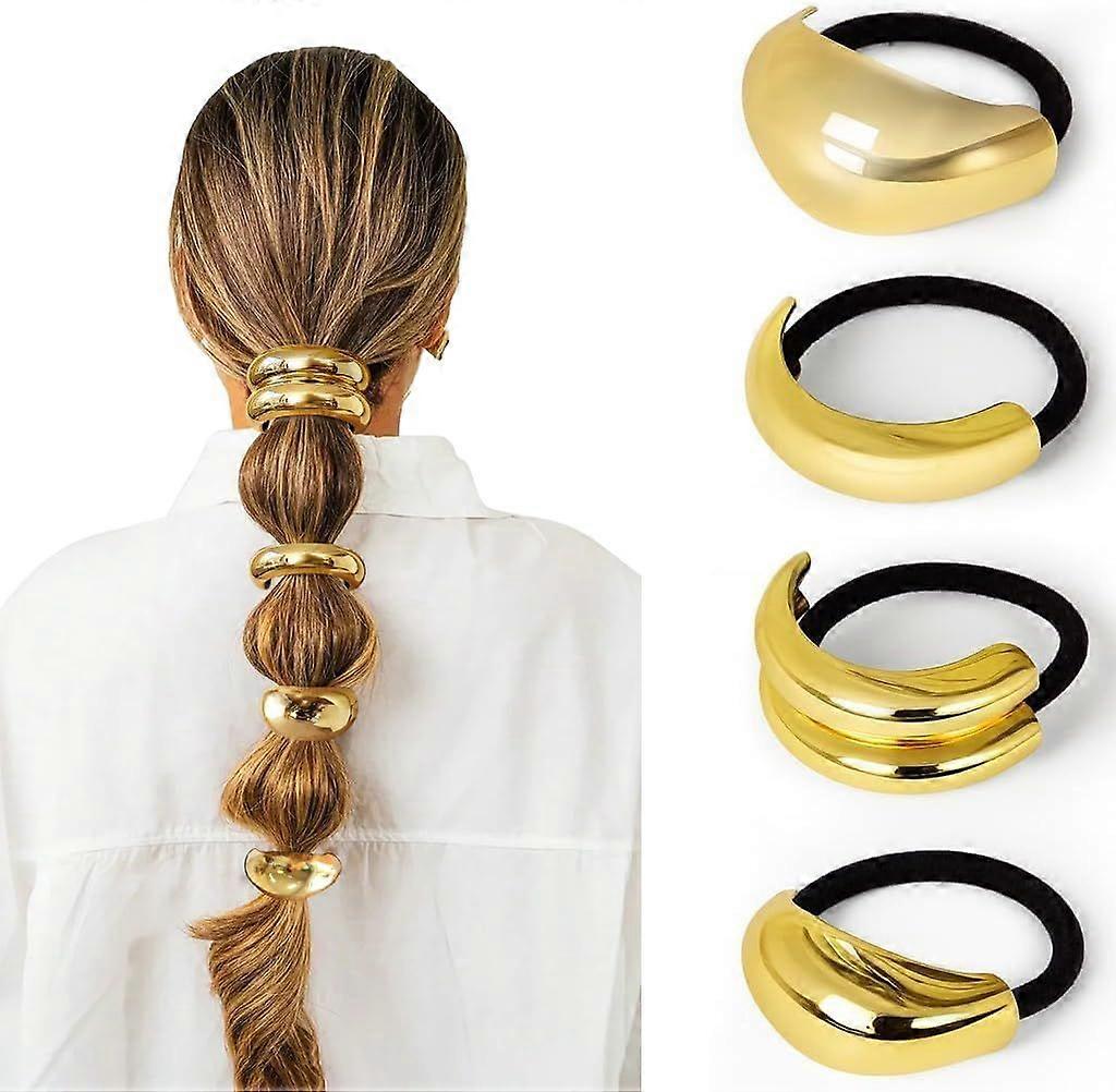 Elegant & Chic: Upgrade any ponytail with these gold hair accessories — stylish, polished, and effortlessly elegant for both casual and formal occasion 4 Versatile Styles: Includes 4 unique gold hair ties with elegant geometric designs — perfect for mixing, matching, or wearing solo to elevate any ponytail or bun Strong Hold: Made with high-elastic bands and gold cuffs for a secure, non-slip hold on long, thick, thin, or curly hair Gentle on Hair: The sturdy elastic stretches comfortably without snagging, pulling, or leaving dents — keeping your hair smooth, secure, and comfortable all day Perfect Gift: These gold hair ties are both stylish and practical — a thoughtful gift for women, girls, or loved ones on birthdays, anniversaries, or any special occasion