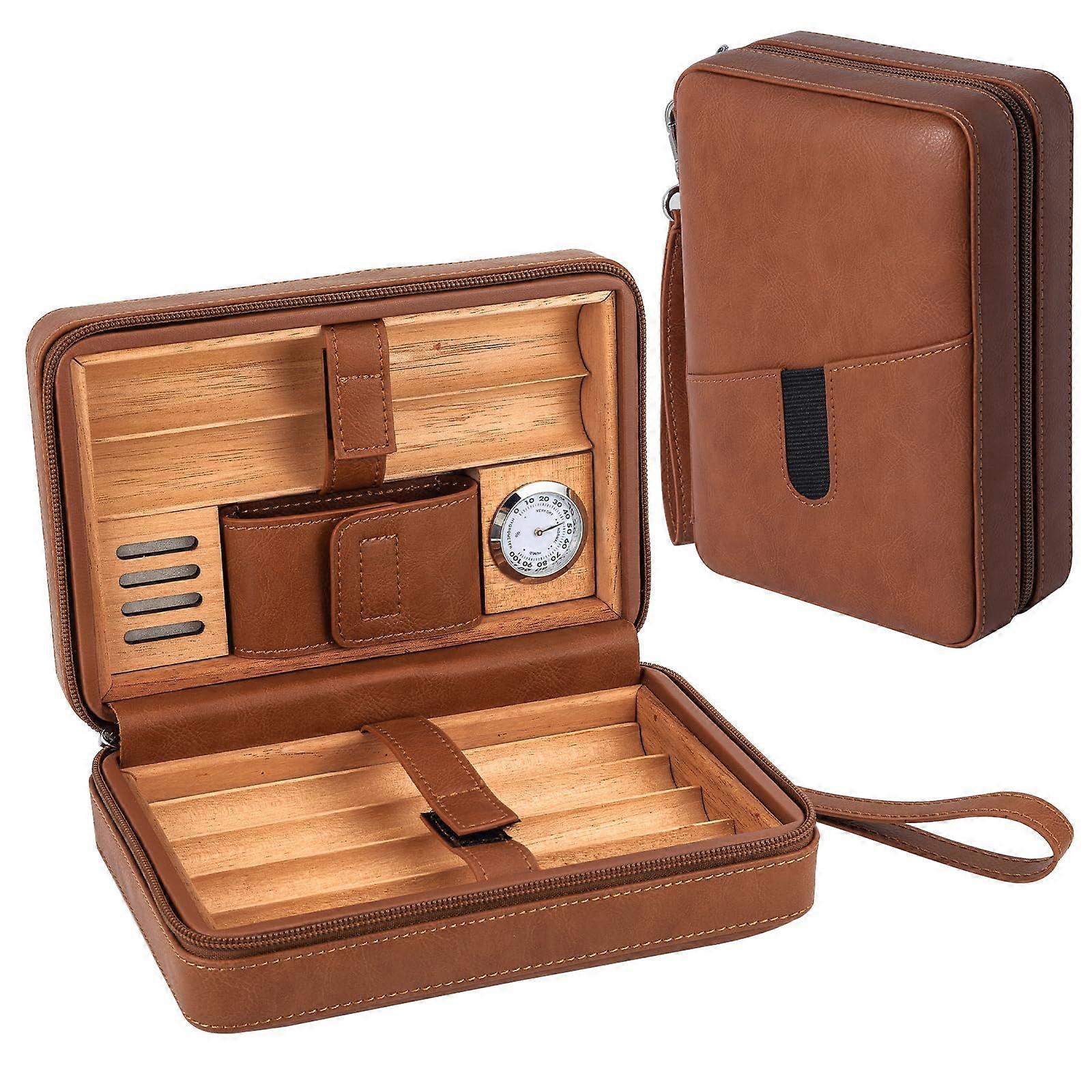 Cigar Travel Humidor Leather Case with Cedar Wood, Hygrometer, Airtight Lock, 6 Cigar Capacity