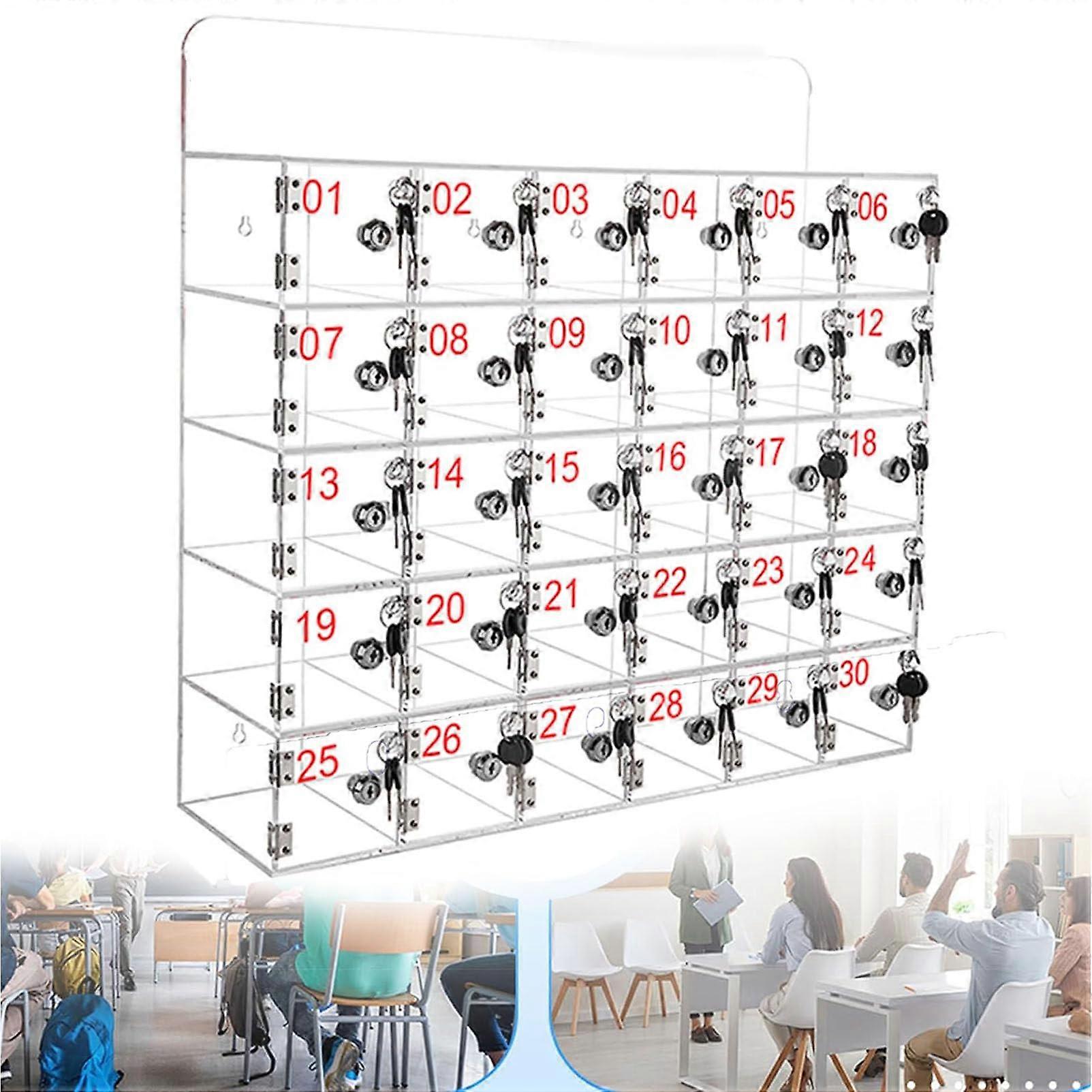 30 Slot Cell Phone Locker Box with Keys, Clear Acrylic Wall Mounted Phone Storage Cabinet