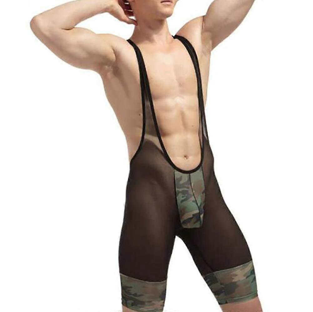 Men Camouflage Wrestling Singlet Jumpsuit with Breathable Mesh Boxer Briefs and Contoured Pouch M Green