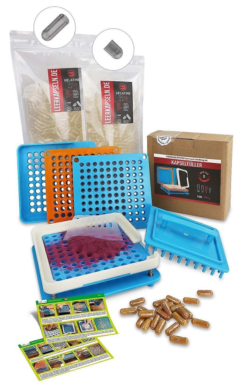 Capsule Filler with 100Hole Plate Capacity and compatibility: fills 100 empty size 0 capsules at once (length 21 mm, diameter 7 mm) using a pressing process. Suitable for gelatin or HPMC capsules as they are standardized. Note the size when selecting capsules. Powder capacity: up to 300–500 mg per capsule depending on the powder used (such as herbs or vitamins). Included empty capsules 1000 empty gelatin capsules are included with the . Capsules are preseparated into caps and sleeves and delivered in separate bags, eliminating the need to open each capsule by hand. Benefits Beginnerfriendly: simple, manual operation with straightforward handling. Compact and practical: device dimensions 20 x 20 cm, easy to store. Easy to clean: designed for straightforward maintenance. Operating instructions Instructions are printed and colorillustrated on a DIN A5 sheet. English language may not be . Use scenarios supplement preparation: prepare herb or vitamin capsules for daily dosing at home. Smallbatch product testing: create sample capsules for client demonstrations or trials. Formulation development: test different blends in size 0 capsules to refine dosages and combinations.
