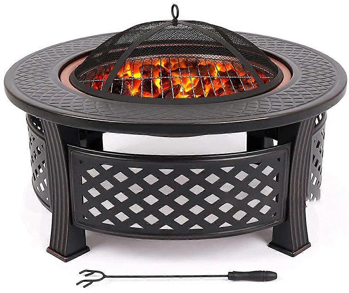 Outdoor Fire Pit with Grill and Lid, Patio Fireplace Bowl with Spark Screen Tripod and Cover