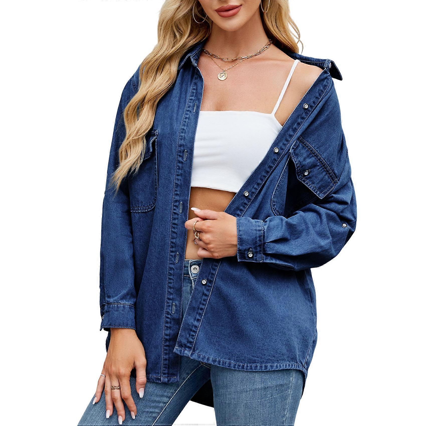 Women Button Down Denim Shirts Casual Long Sleeve V Neck Chambray Blouse Top Deep Blue L