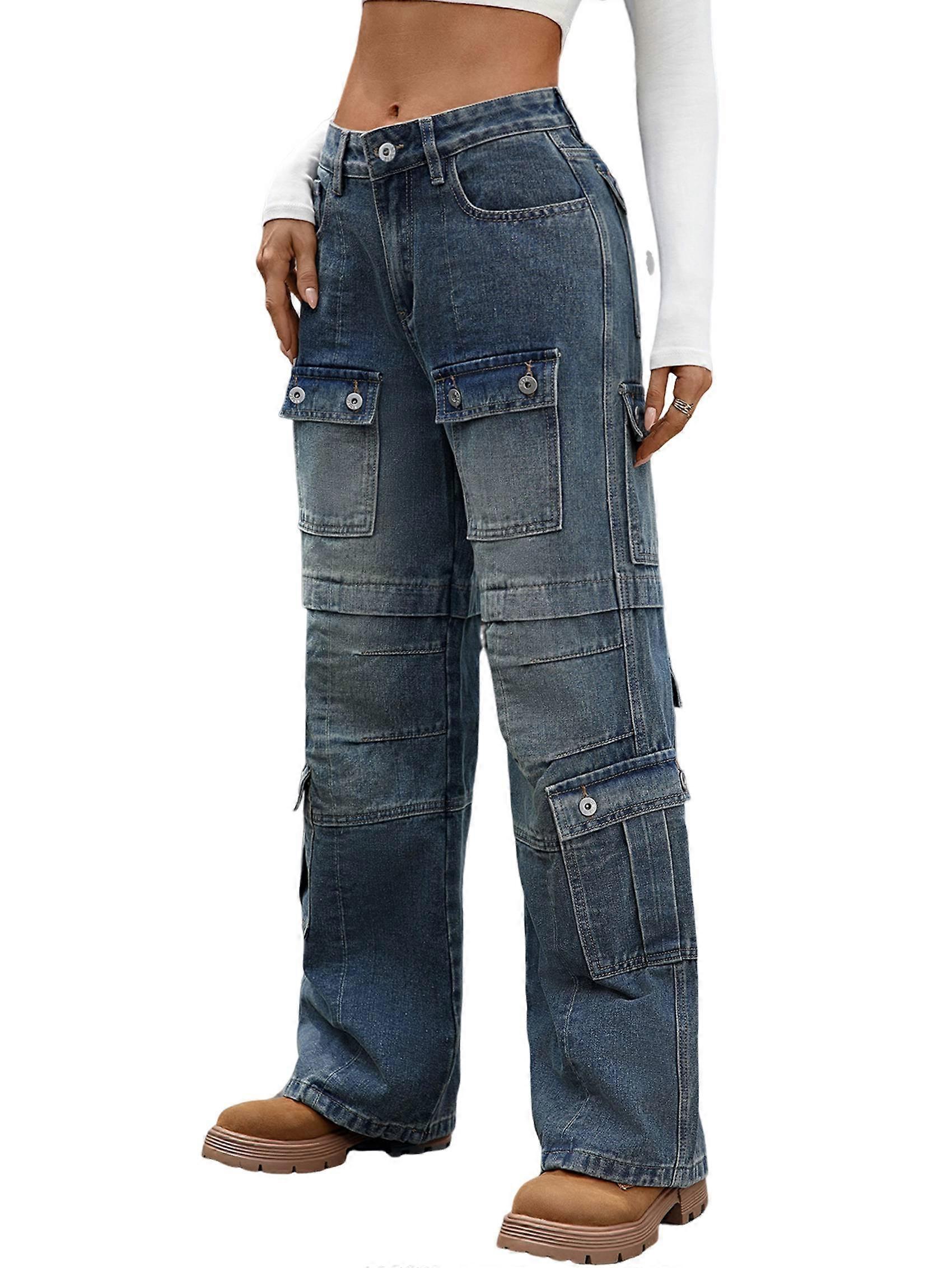 Women'S Cargo Pants Low Waist Baggy Jeans Pocket Wide Leg Casual Trendy Streetwear Blue XL