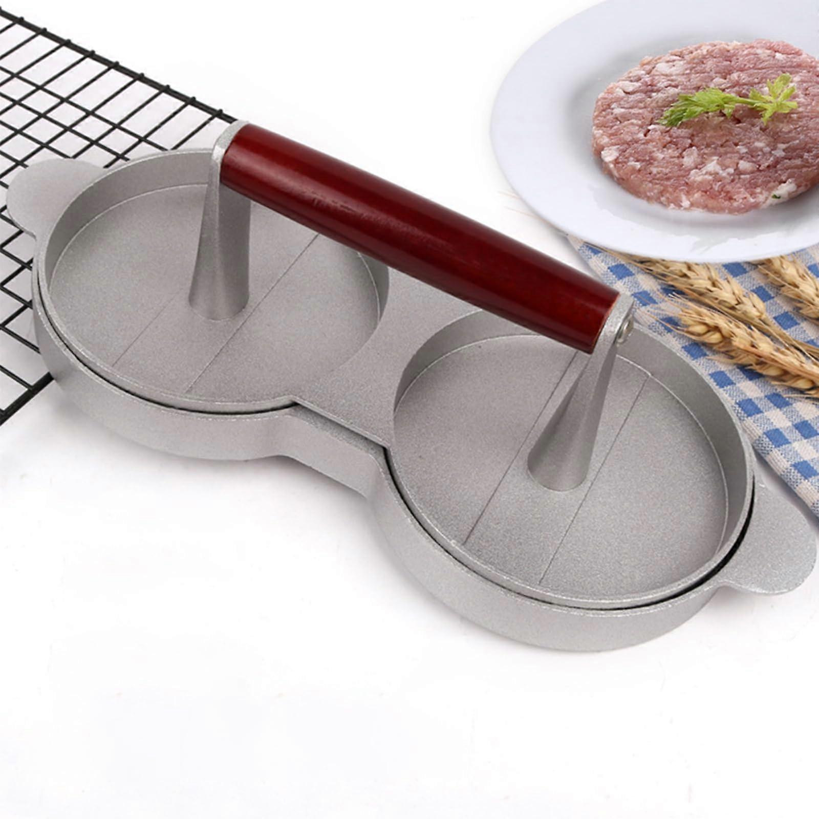 Burger Press for Two Patties A simple, durable tool for making two uniform hamburger patties at once. Designed for home grills, griddles, and BBQs, this press helps you produce consistent, evenly shaped burgers every time. Key benefits Dual patty design saves time by forming two identical patties at once, reducing prep time for meals and gatherings. Stainless steel construction with a wooden handle provides durable performance and comfortable, stable pressure across both patties. Nonstick pressing surface lets patties release cleanly for neat presentation and easy handling. Creates uniform thickness and size for even cooking on grills, griddles, or skillets. Easy to clean: rinse or wipe after use; dishwasher safe for quick cleanup. Versatile for beef, turkey, chicken, veggie, and cheesestuffed burgers. How it solves common problems Eliminates uneven patties that cook inconsistently by producing identical shapes and thicknesses. Reduces time and effort when preparing multiple burgers for gatherings or weekly meal prep. Prevents sticking and mess with a nonstick surface that simplifies demolding and cleanup. Practical uses Backyard BBQs and grill nights: make two matchingly shaped beef or cheese burgers at once for a faster cook. Meal prep and freezing: batchproduce uniform patties for convenient storage and predictable cooking times. Stuffed or layered burgers: form matching and bottom patties for assembled or cheesestuffed recipes. Product attributes Function: dualpatty forming and pressing for consistent burger size and thickness. Compatibility: suitable for use with grills, griddles, stovetops, and ovenready patties. Material: stainless steel body with wooden handle for durability and comfortable use. Performance: nonstick surface for easy release; dishwasher safe for convenient cleaning. A practical, reliable tool for anyone who wants consistent, wellformed burgers with less effort.