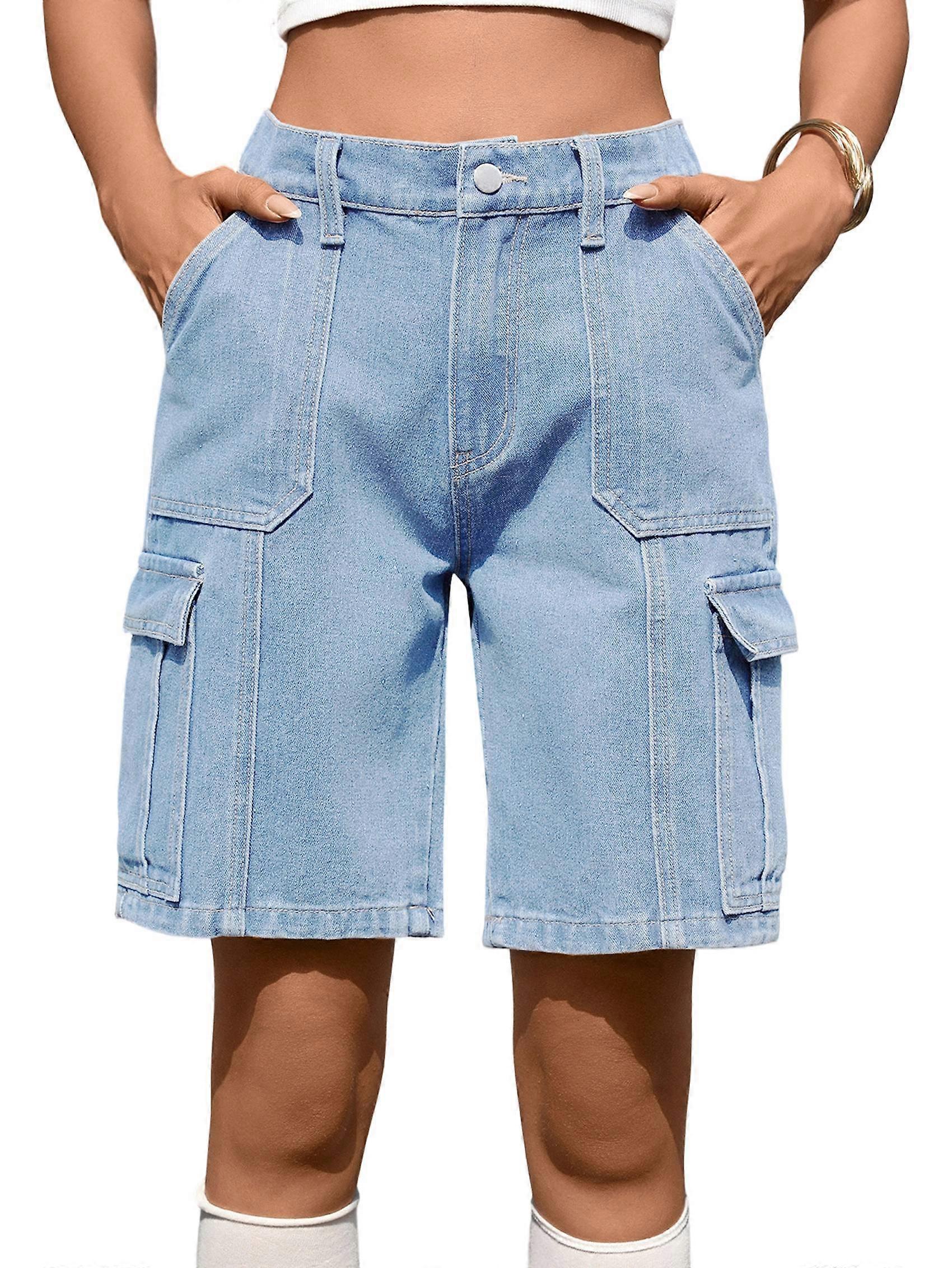 Bermuda Cargo Shorts for Women Casual Long Knee Length High Waisted Stretch Wide Leg Relaxed Fit Light Blue L