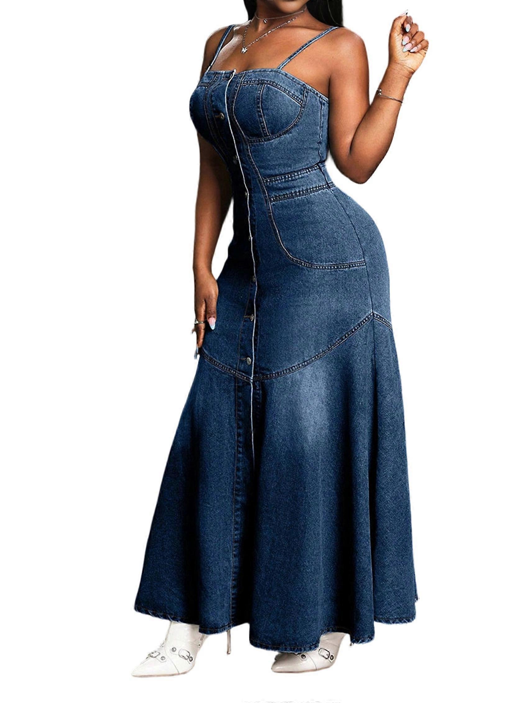 Maxi long denim dress for women, featuring adjustable spaghetti strap over shoulder, front button down closure, easy to put on and take off, a-line flared silhouette perfectly outlines your body, smocked back design can add more comfort, suit most figure types, full length This elegant fishtail jean dress with open back is made of lightweight, stretchy and premium cotton blend material, that's skin-friendly and breathable, ensuring pleasant wearing experience in summer and hot weather Chic button down sundress is versatile to pair with your sandals, straw hat, necklace, earrings for summer, that is comfortable both and flattering. Also it is great to match with jacket or cardigan in spring and fall. It also can be worn as camisole overall dress, you can match with your t-shirt or tank tops A must-have women's denim dress in your wardrobe. Suitable for daily wear, office, wear to work, street wear, school, night out, club wear, dating, dinner, beach, vacation, wedding guest dress, cocktail party, graduation, semi formal occasions and so on Size: S=US4=UK8=EU36(cm / inch) Bust: 83.0 / 32.68, Length: 121.0 / 47.64, Waist: 69.0 / 27.17, Hip: 102.0 / 40.16 Colour: Deep Blue Material: 85% Cotton, 15% Polyester Package Contents: 1*Women's Jean Dress Only the above package content, other products are not included. Note: Light reflection and different displays may cause the color of the item in the picture a little different from the real thing. The measurement allowed error is +/- 1-3cm.