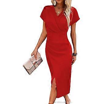 Women'S Casual Waist Tie V Neck Fresh Style Sleeve Attached Dress Summer Flowy Midi Gown Red M