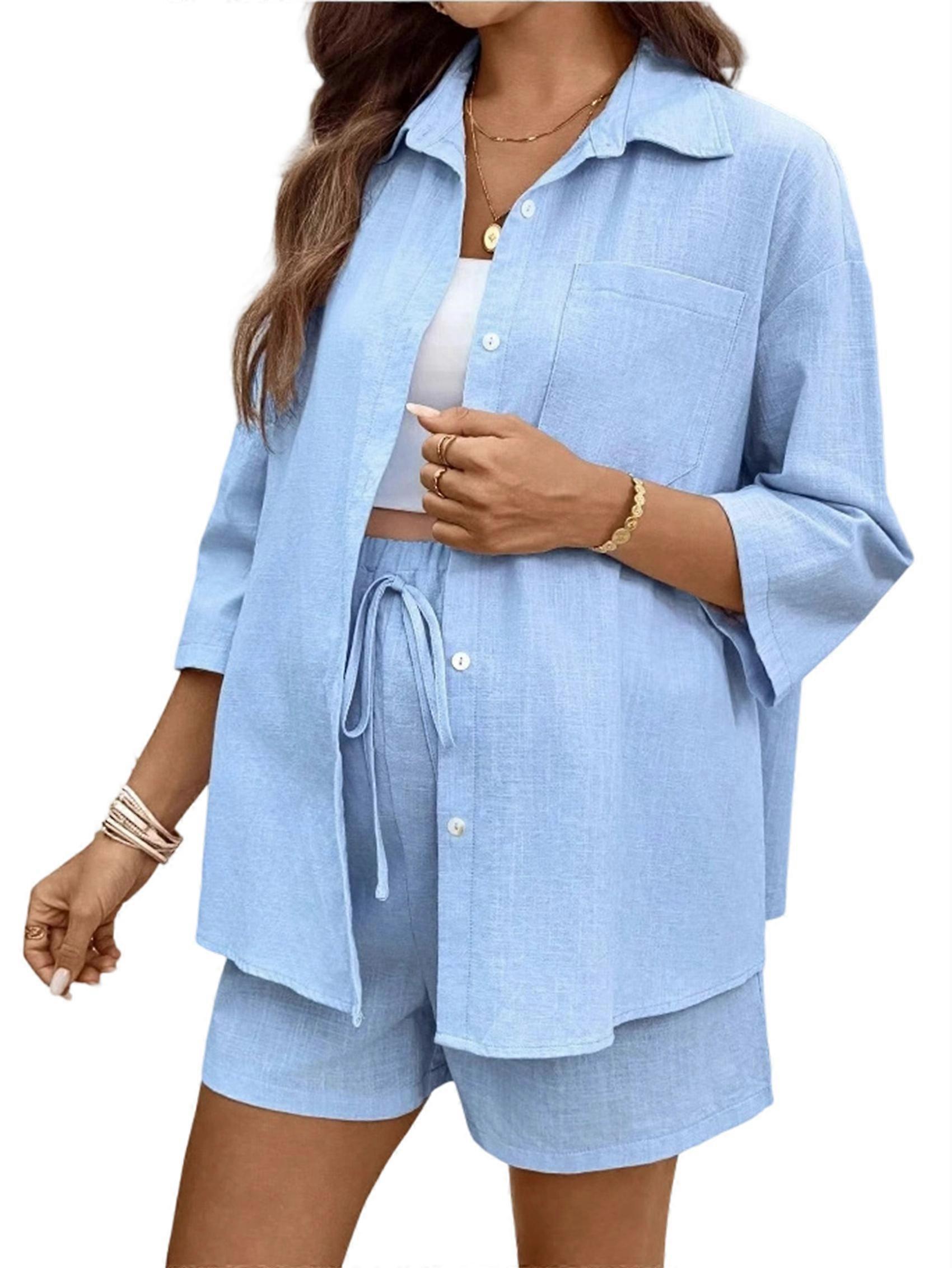 Women'S Maternity Pajamas Sets 2 Piece Outfits Short Sleeve Shirts and Biker Shorts Pregnancy Loungewear Light Blue XL