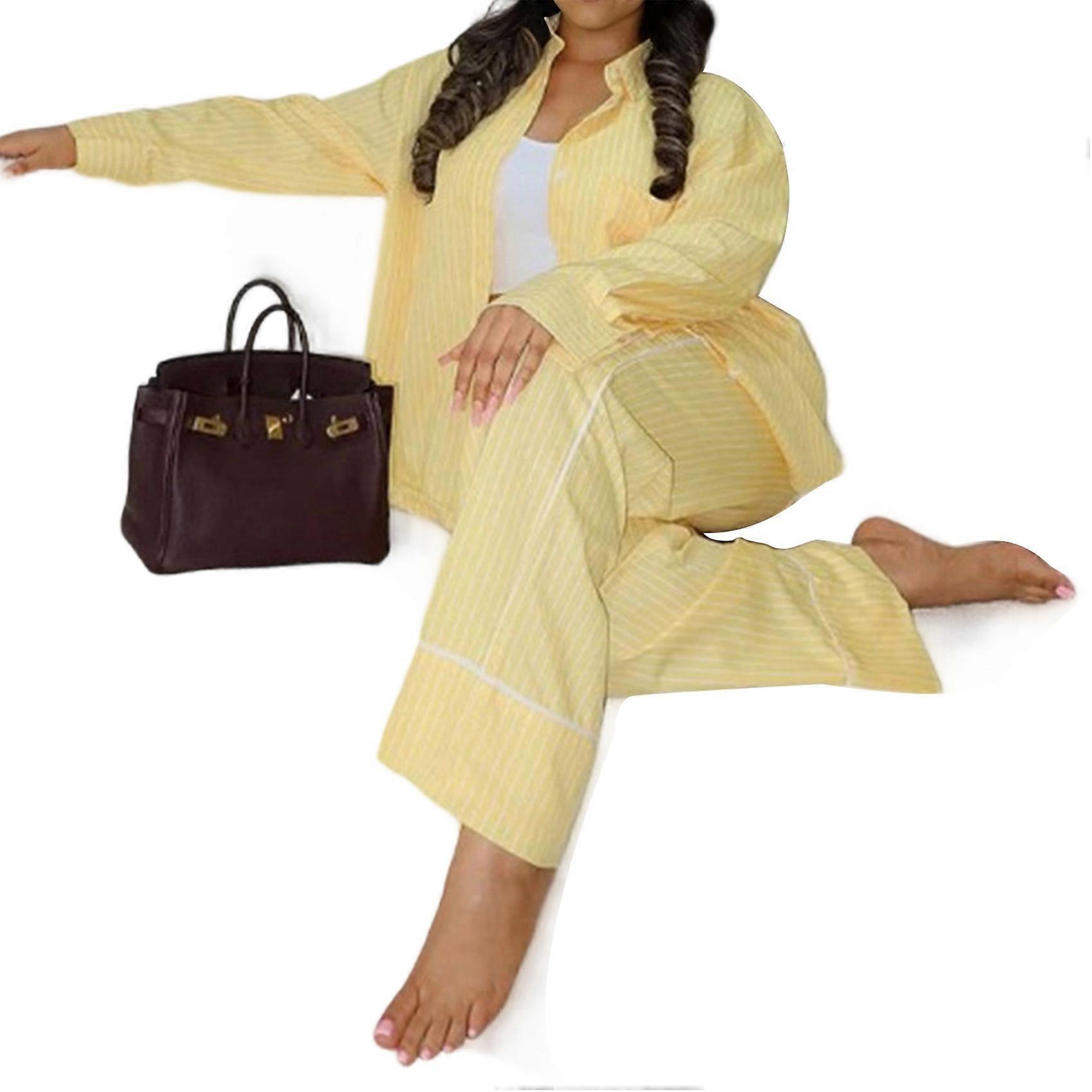 Women'S Striped Loungewear Set - Comfortable Two-Piece Long Sleeve Shirt and Pants for Fall and Winter Bright Yellow XL