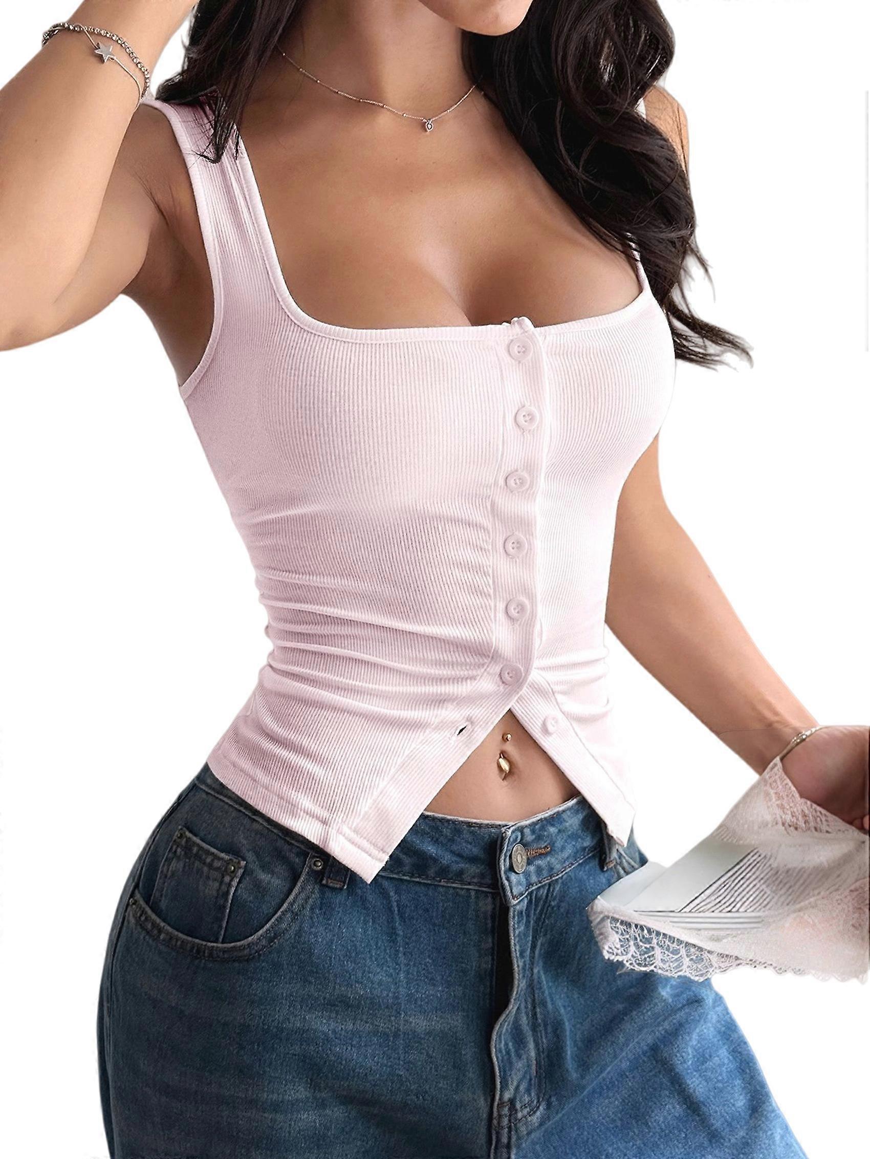 Button Up Tank Tops for Women Ribbed Sleeveless Button Down Shirts Vest Y2k Crop Top Basic Fitted Vest Light Pink M