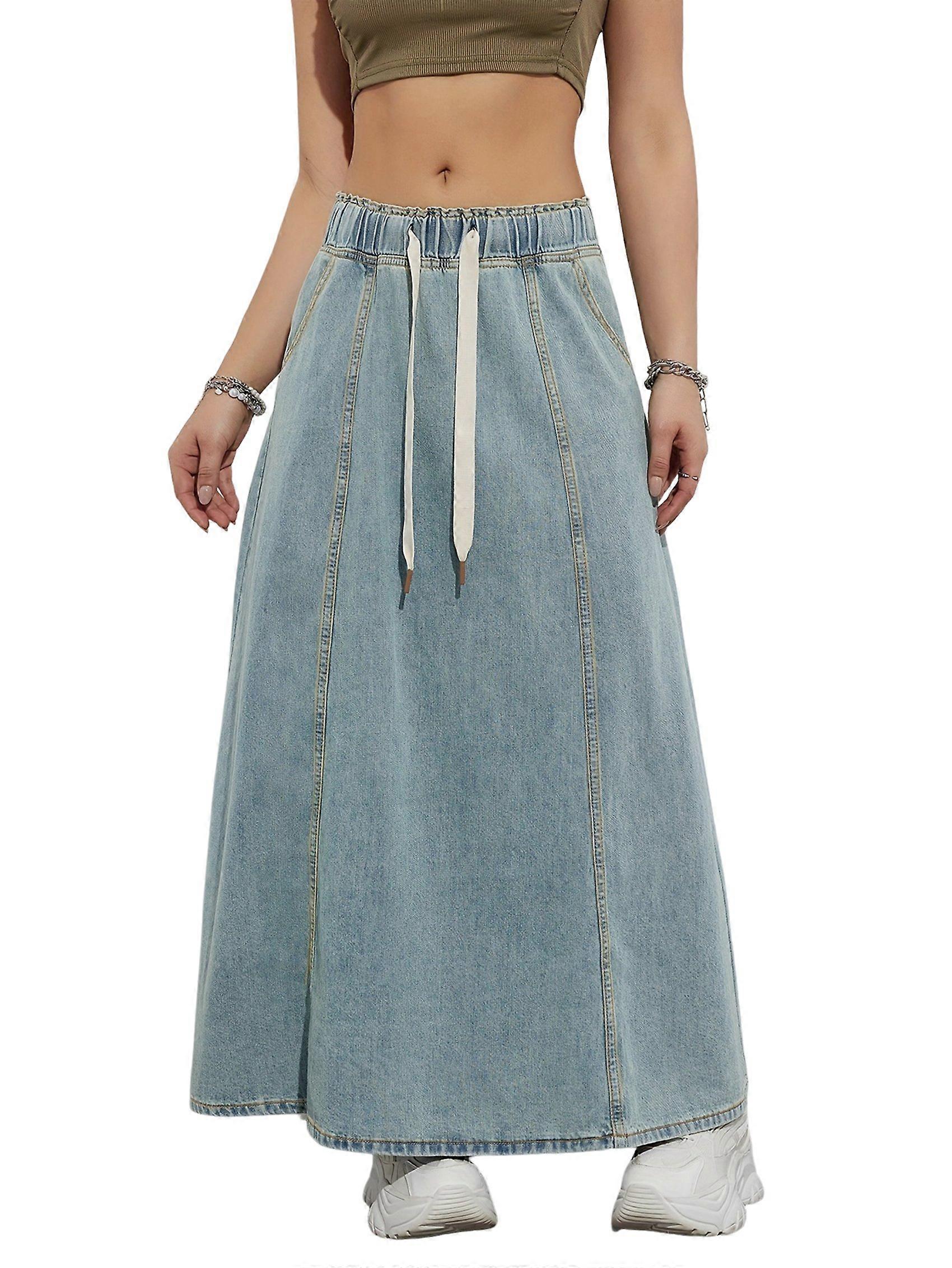Women'S Casual Elastic High Waist A Line Long Maxi Flare Denim Skirt Light Blue M
