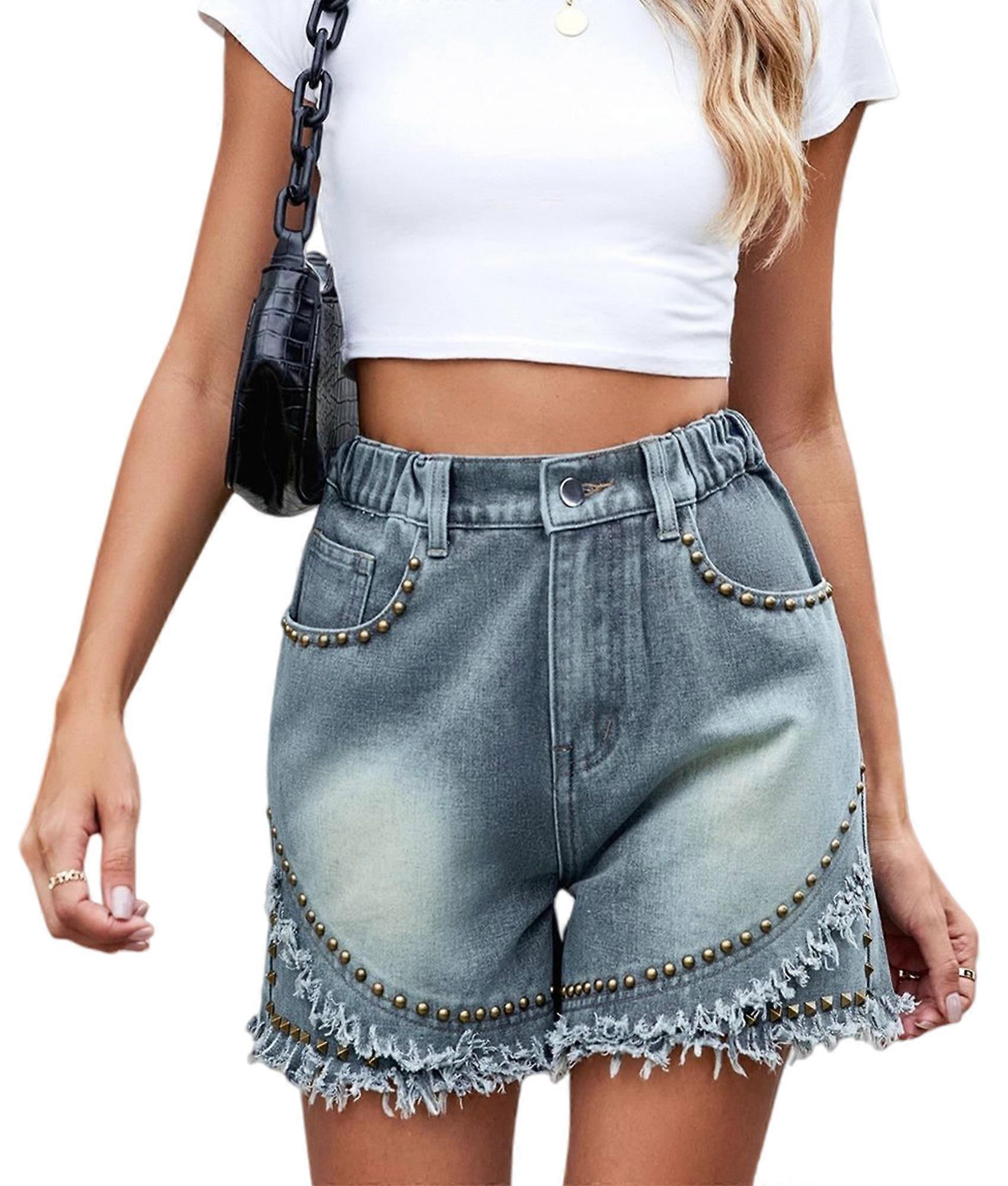 Women'S Mid Rise Denim Shorts Rivet Studded Ripped Frayed Raw Hem Hot Short Jeans Blue XXL