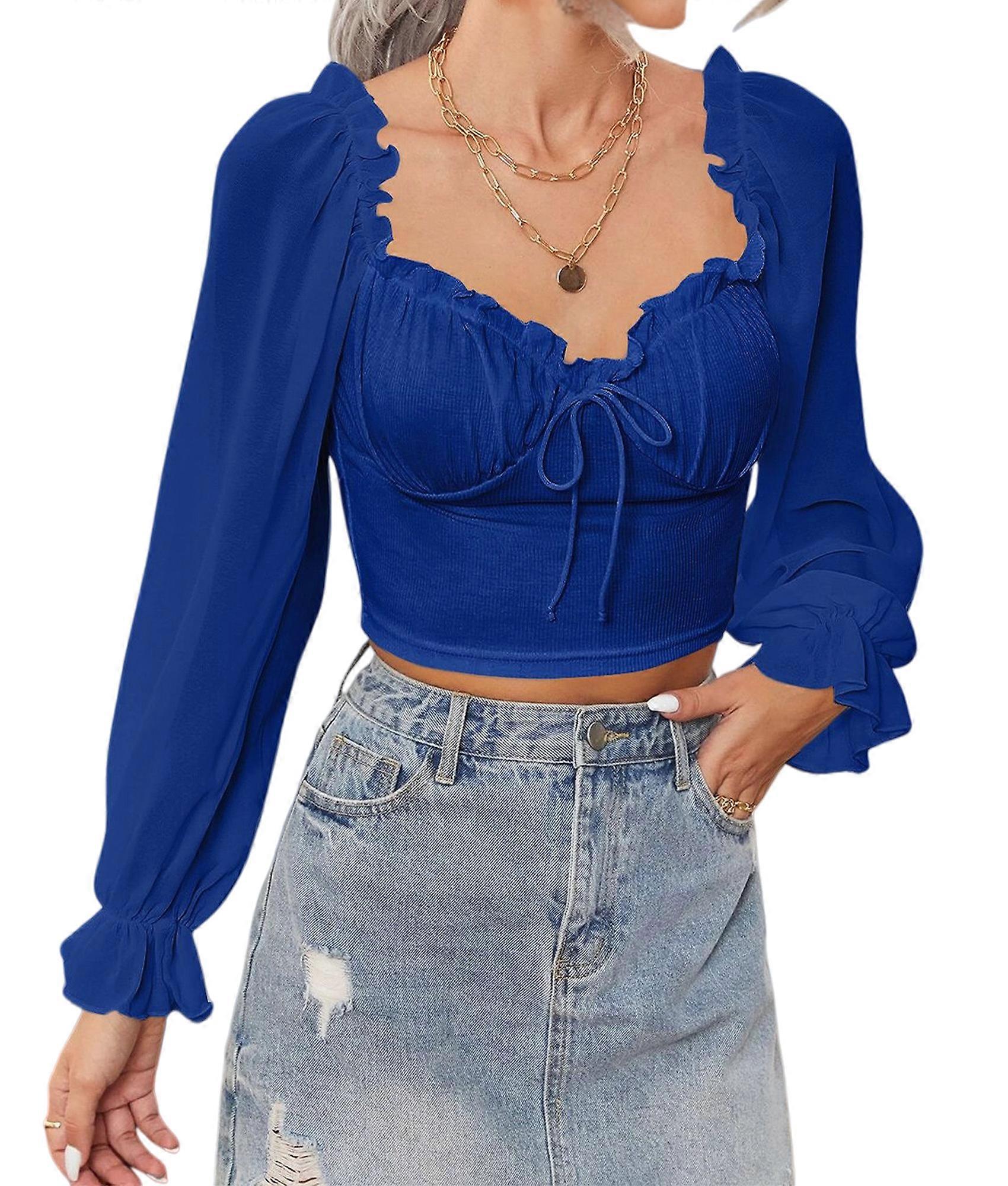 Women'S Sheer Mesh Sweetheart Neck Top Ruffled Flounce Long Sleeve Blouse Tied Detail Premium Fit Blue S