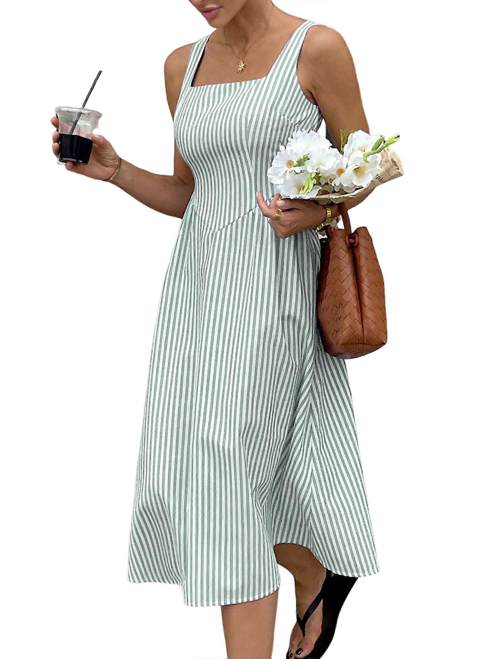 Women'S Maxi Striped Dress Summer Sleeveless Square Neck Smocked A Line Flowy Spring Vacation Sundress Green M