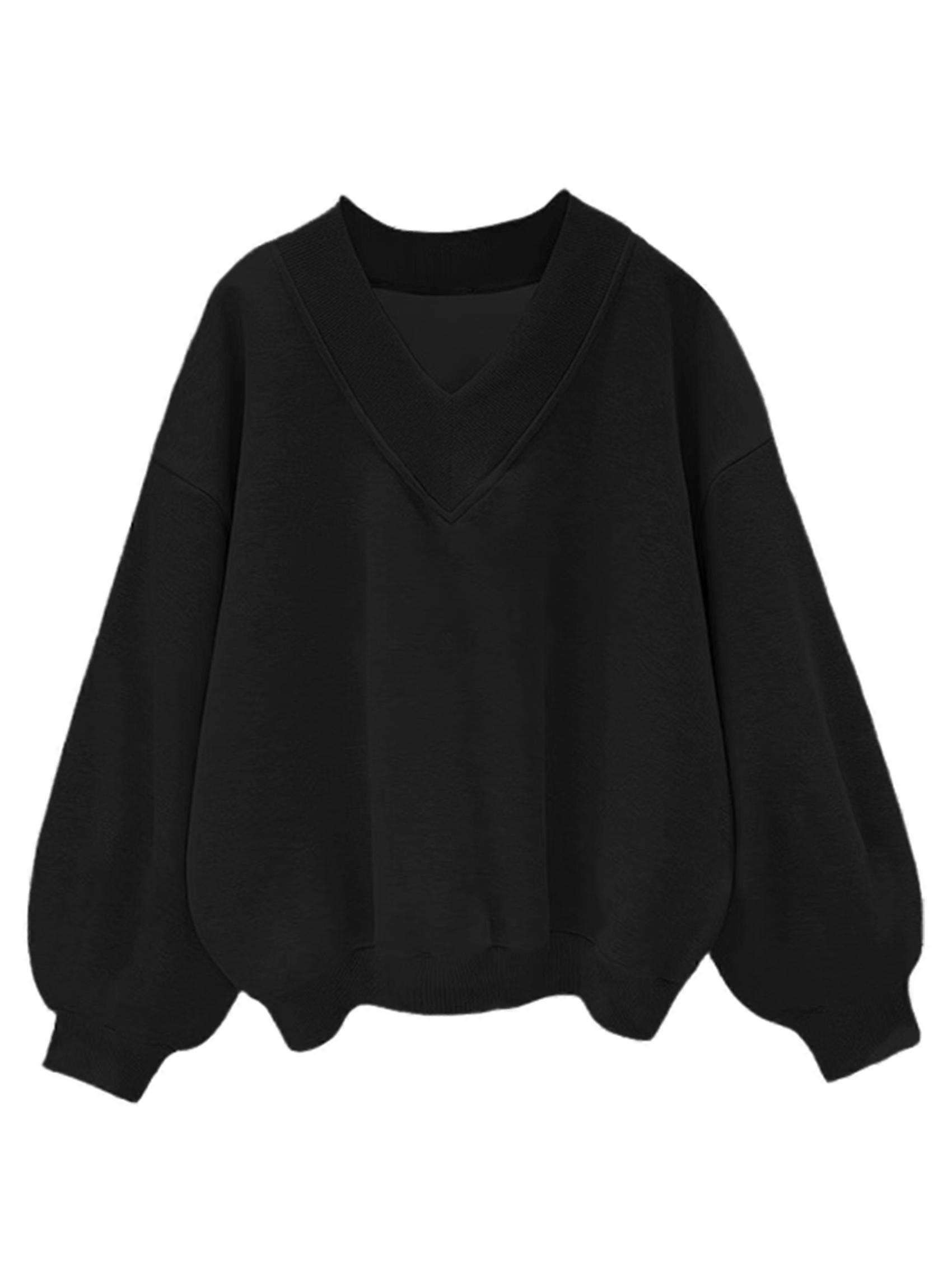 Women V Neck Oversized Sweatshirts Casual Drop Shoulder Long Sleeve Pullover Tops Matte Black M