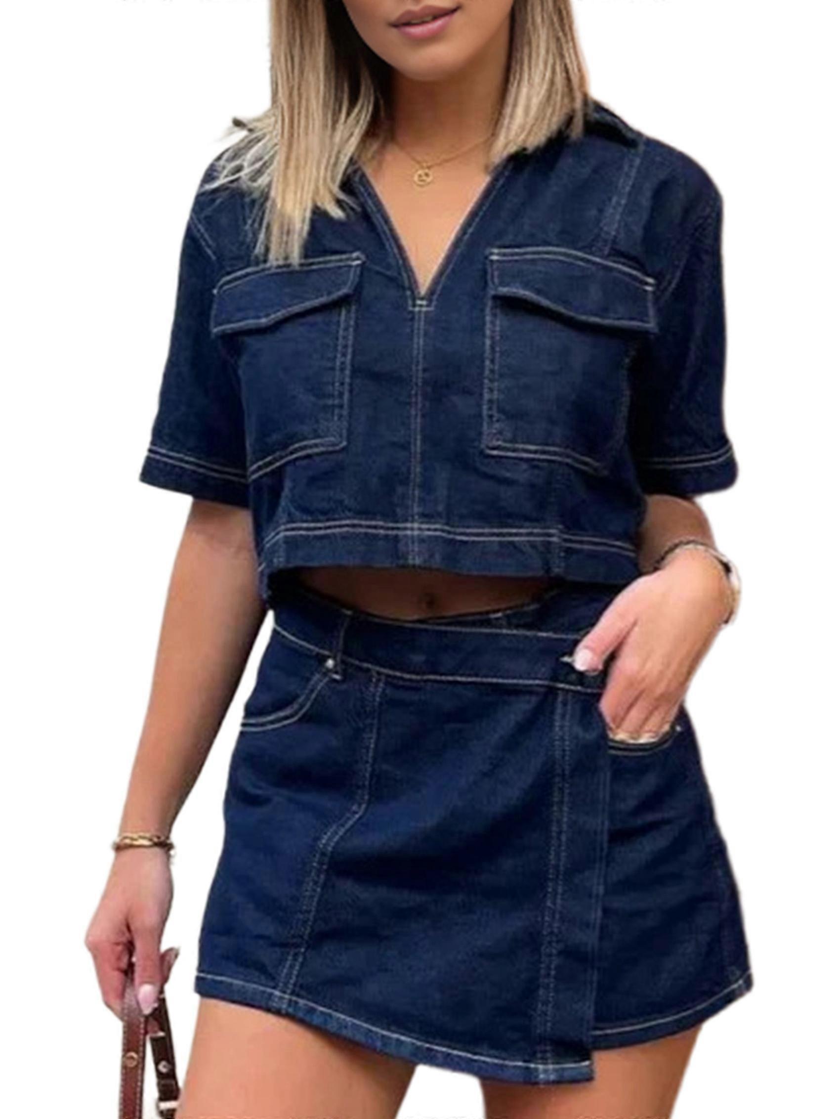 Women'S Denim Skort Set Summer V Neck Short Sleeve Top High Waist Asymmetrical Skirt Pants Deep Blue S