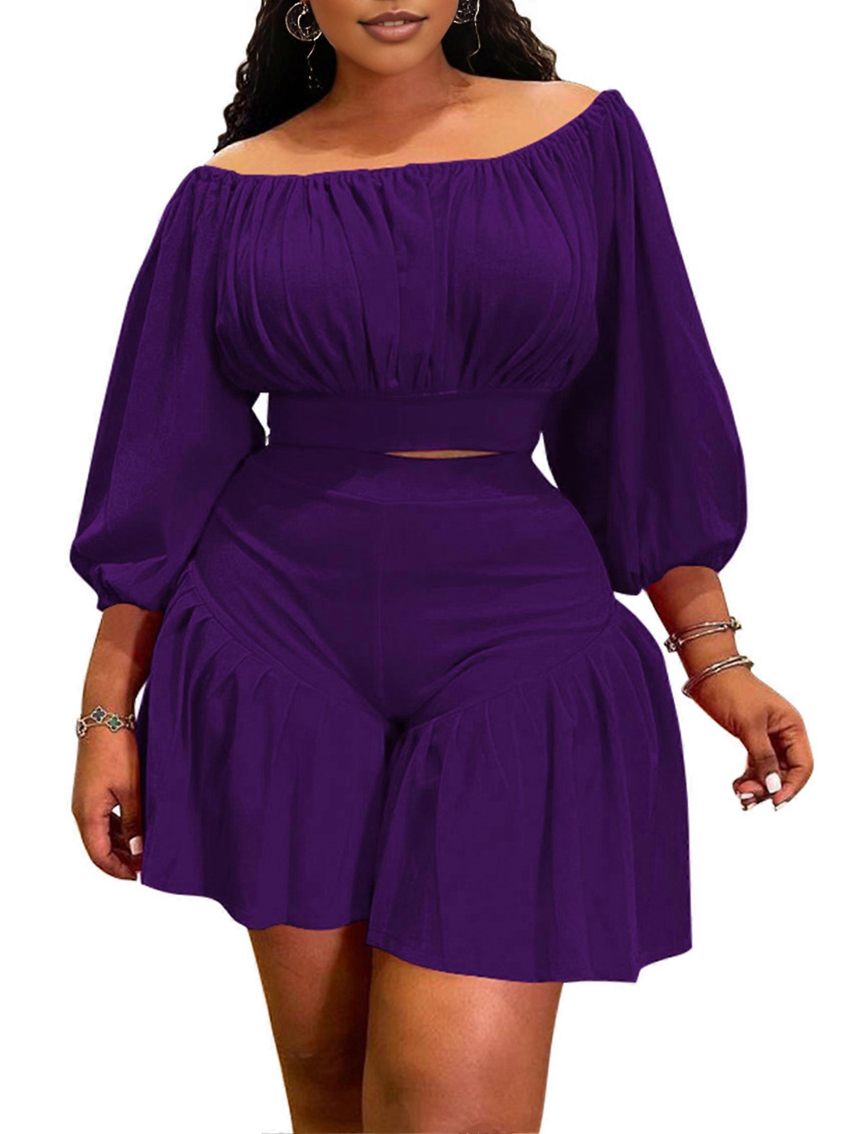 Women'S Plus Size 2 Piece Outfit with Off Shoulder Long Lantern Sleeve Crop Top and Ruffle Shorts Purple XXXL
