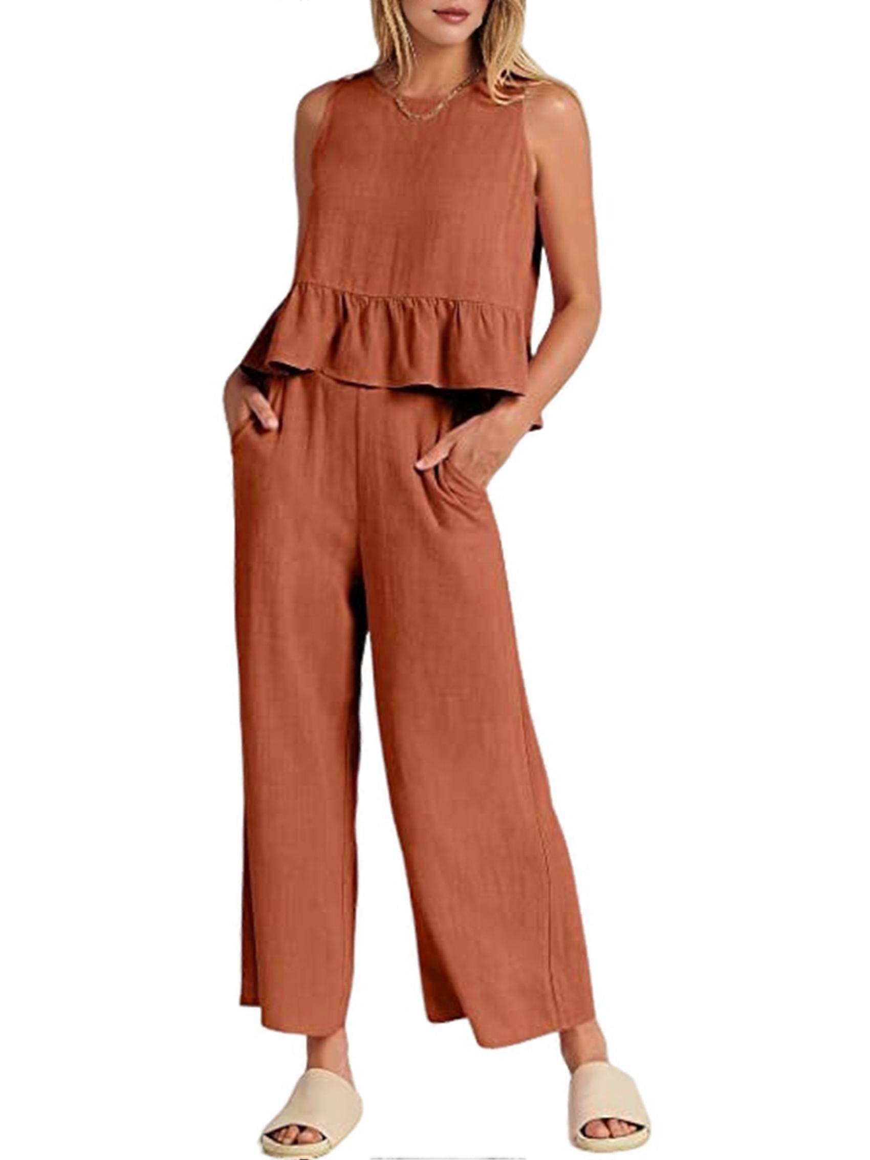Women'S Pants Sets 2 Piece Outfits Sleeveless Round Neck Tank Tops Elastic Waist Wide Leg Orange L