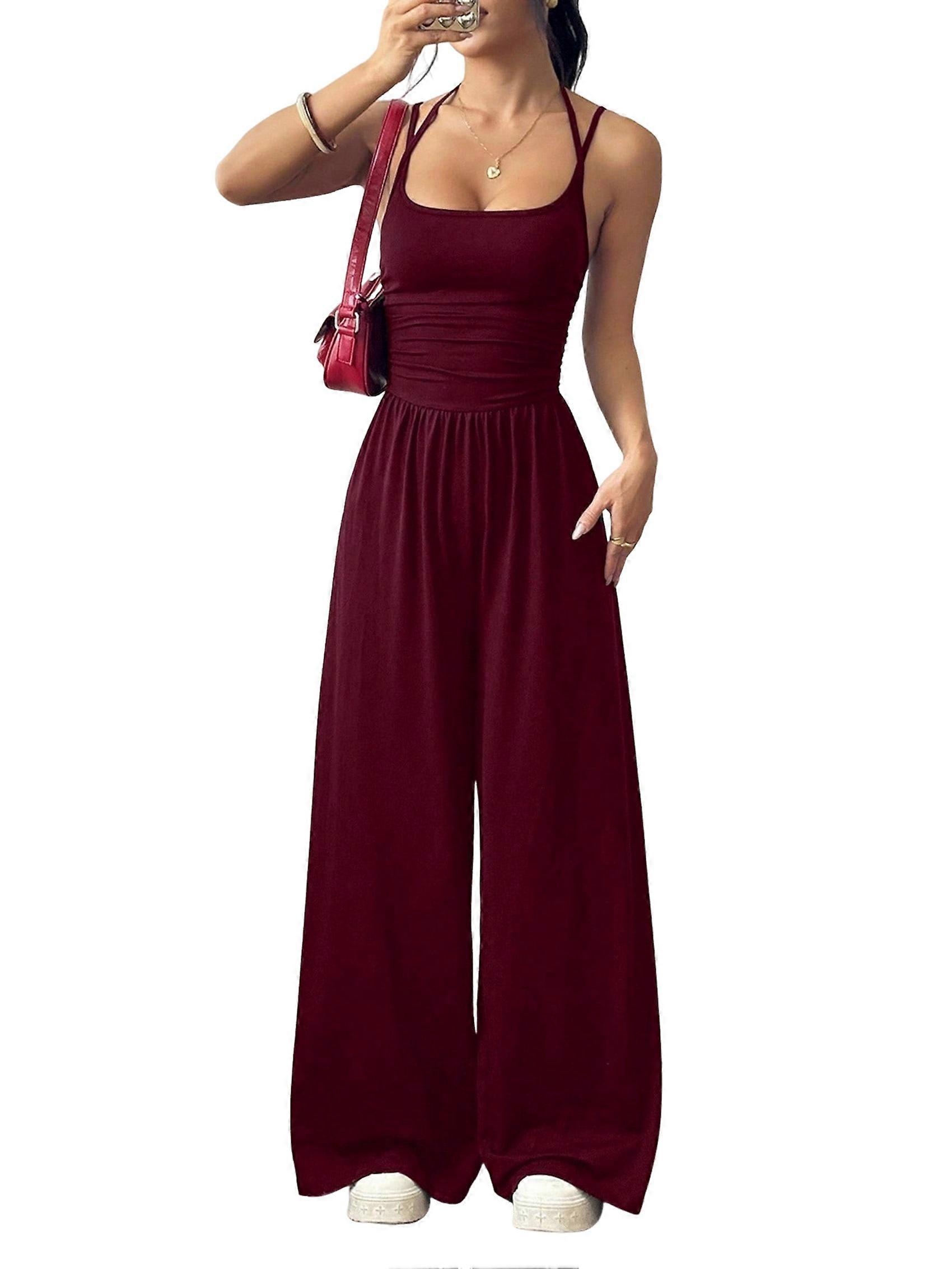 Women'S Summer Jumpsuit Spaghetti Strap One-Piece Outfit Wide Leg Baggy Pants Romper Wine Red M