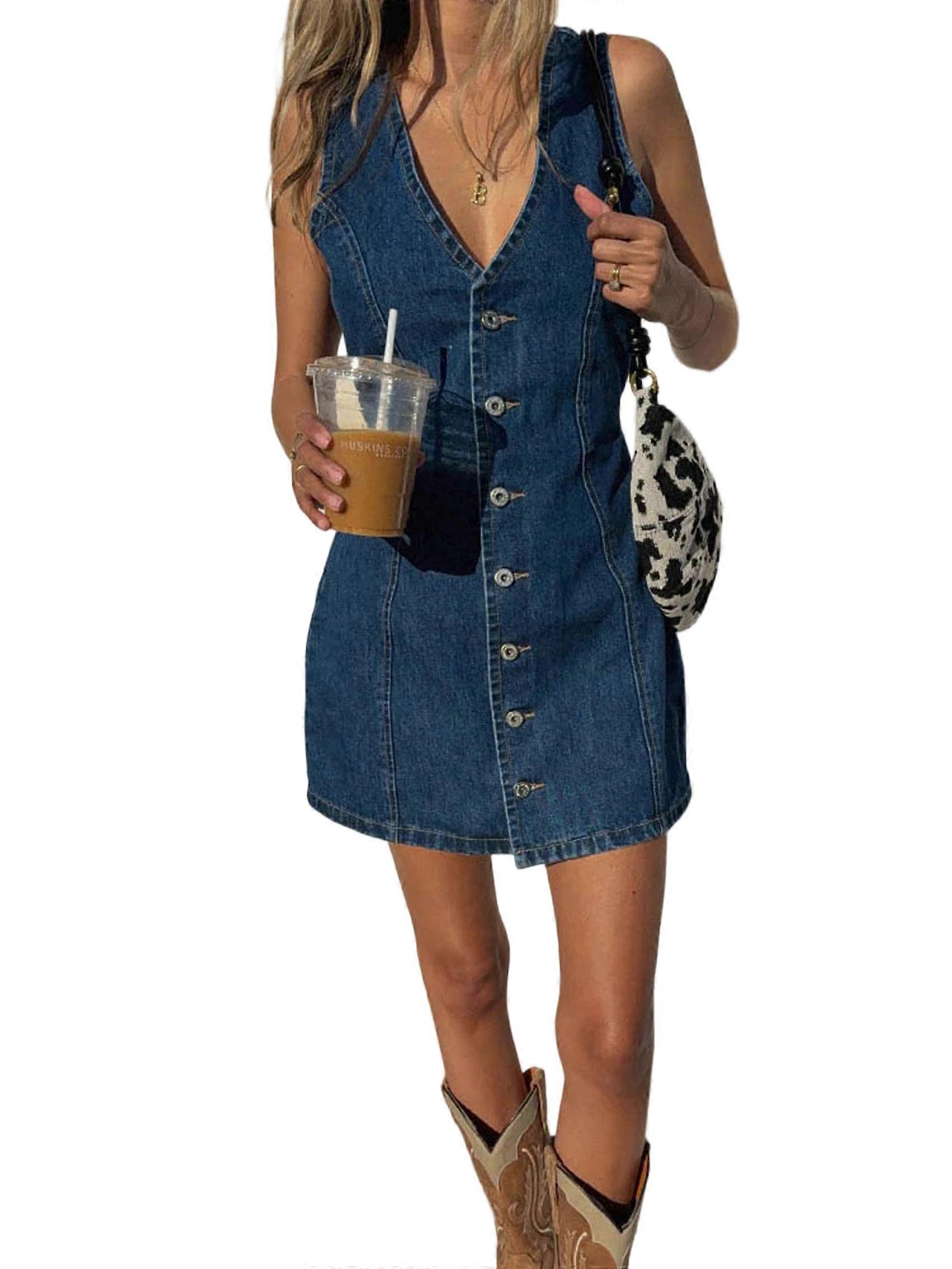 Denim Dresses for Women Sleeveless Stretchy Jean Summer Casual Western Short Button Down Dress Deep Blue S