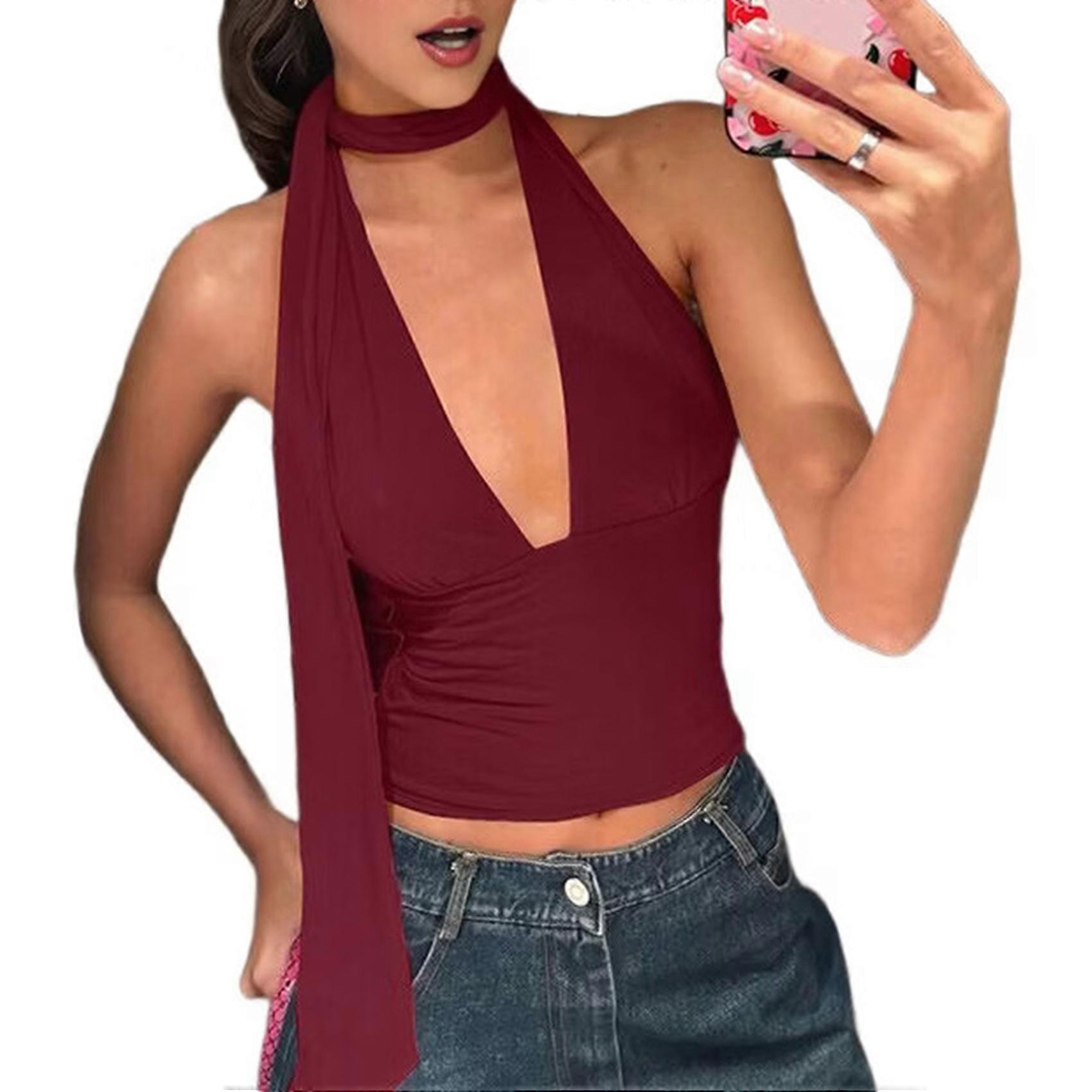Women Going Out Halter Scarf Crop Top Deep V Sleeveless Backless Vest Party Clubwear Wine Red L