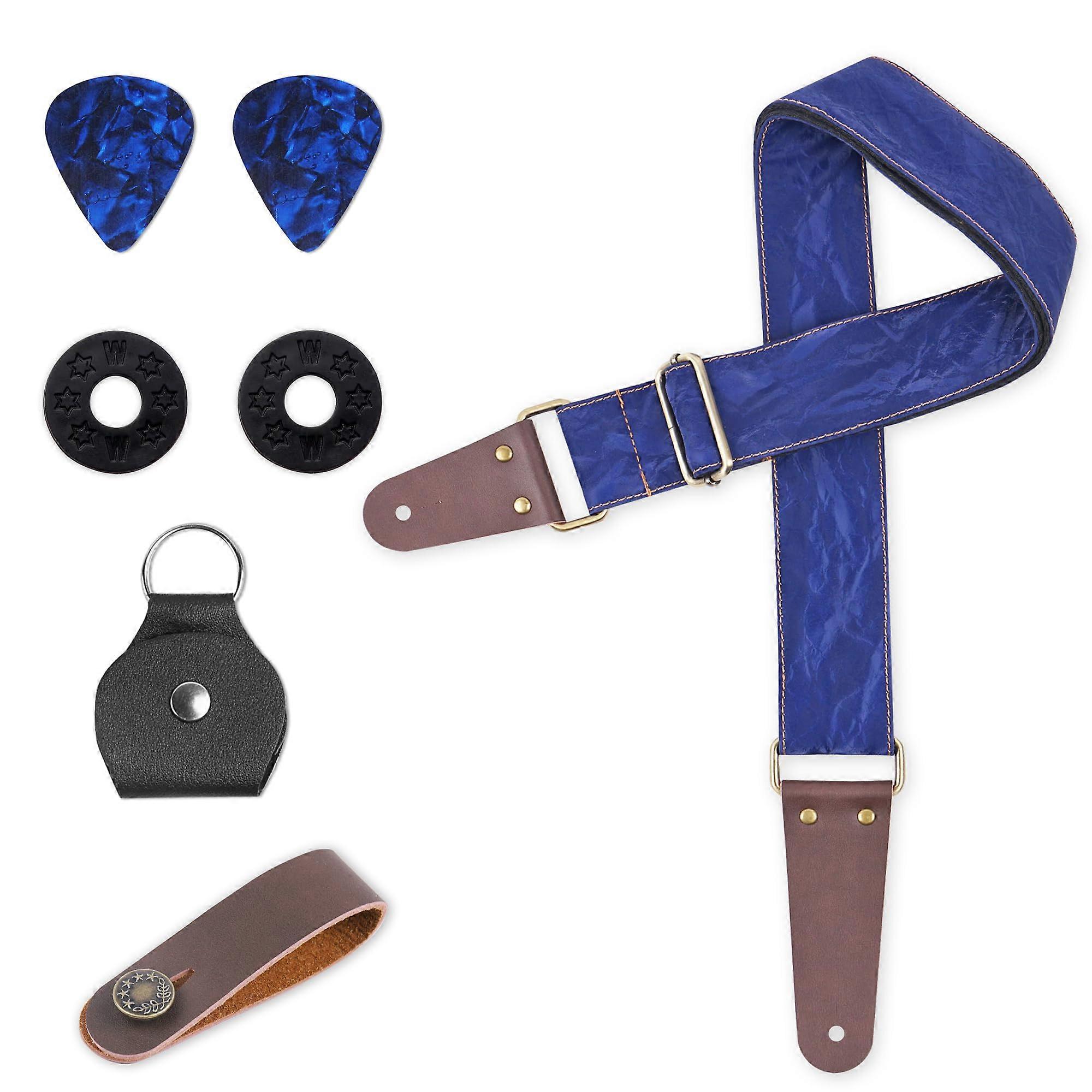 Adjustable Guitar Strap with Leather Ends, Strap Locks and Picks Holder, Silk Blue Comfortable Strap for Acoustic Electric Bass