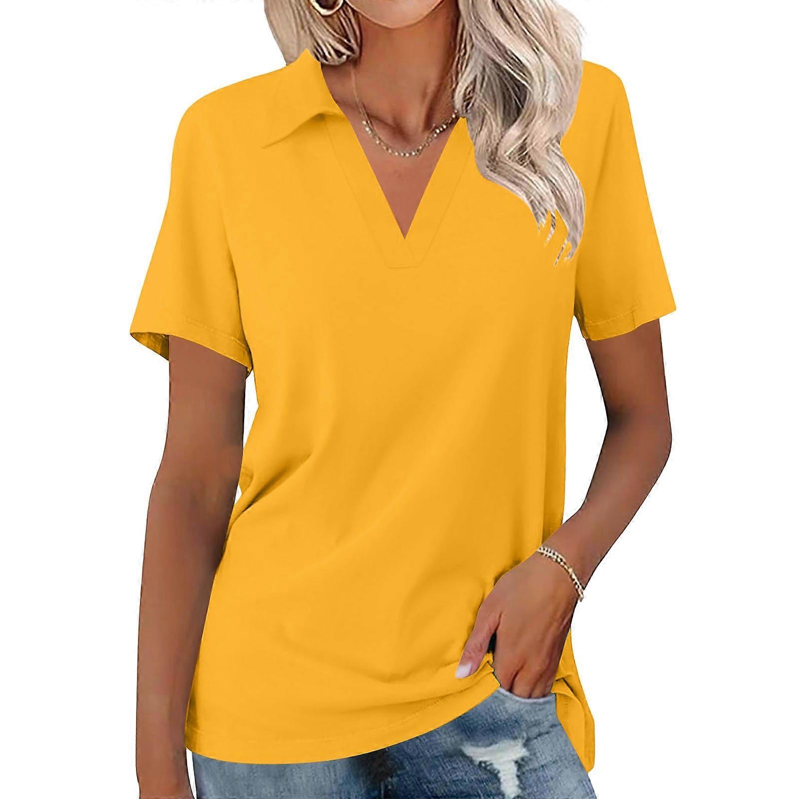 Women's Shirts Short Sleeve V Neck Tops Business Casual Collared Shirts Loose Tees Yellow XL
