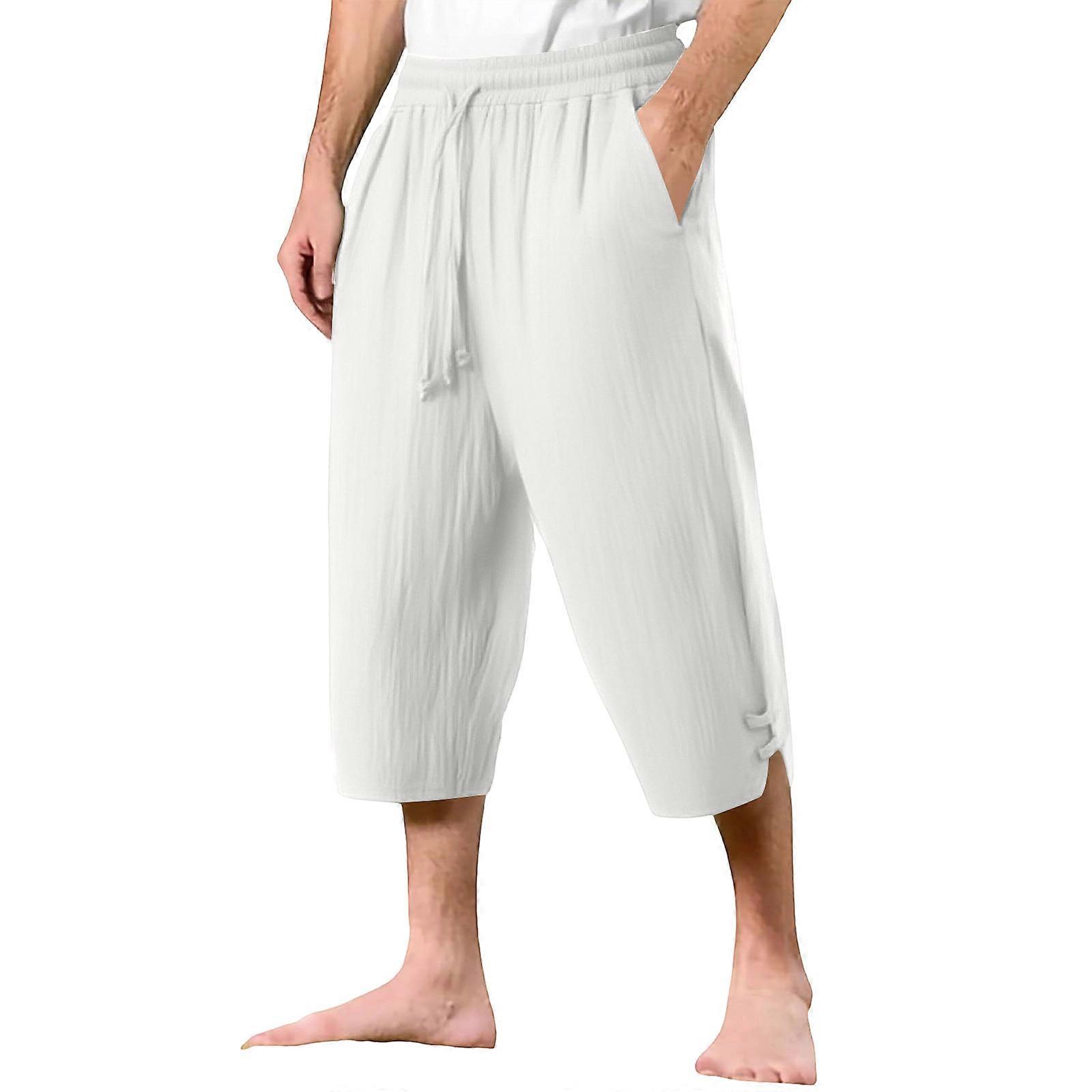 Men's Linen Pants Loose Casual Pants Lightweight Breathable Comfortable Beach Cropped Trousers White XL