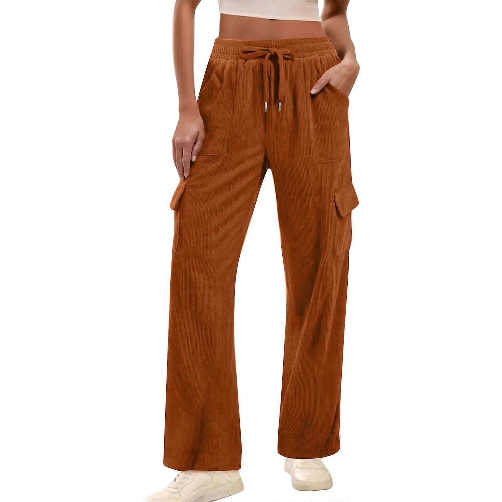 Womens Corduroy Pants Casual High Elastic Drawstring Cargo Loose Fit Wide Leg Pants with Pockets Dark Brown XL