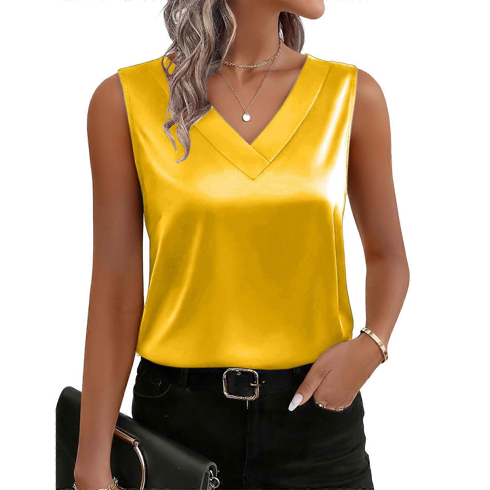 Women's silk camisole, V-neck casual top, sleeveless business work shirt, elegant shirt. Yellow XL